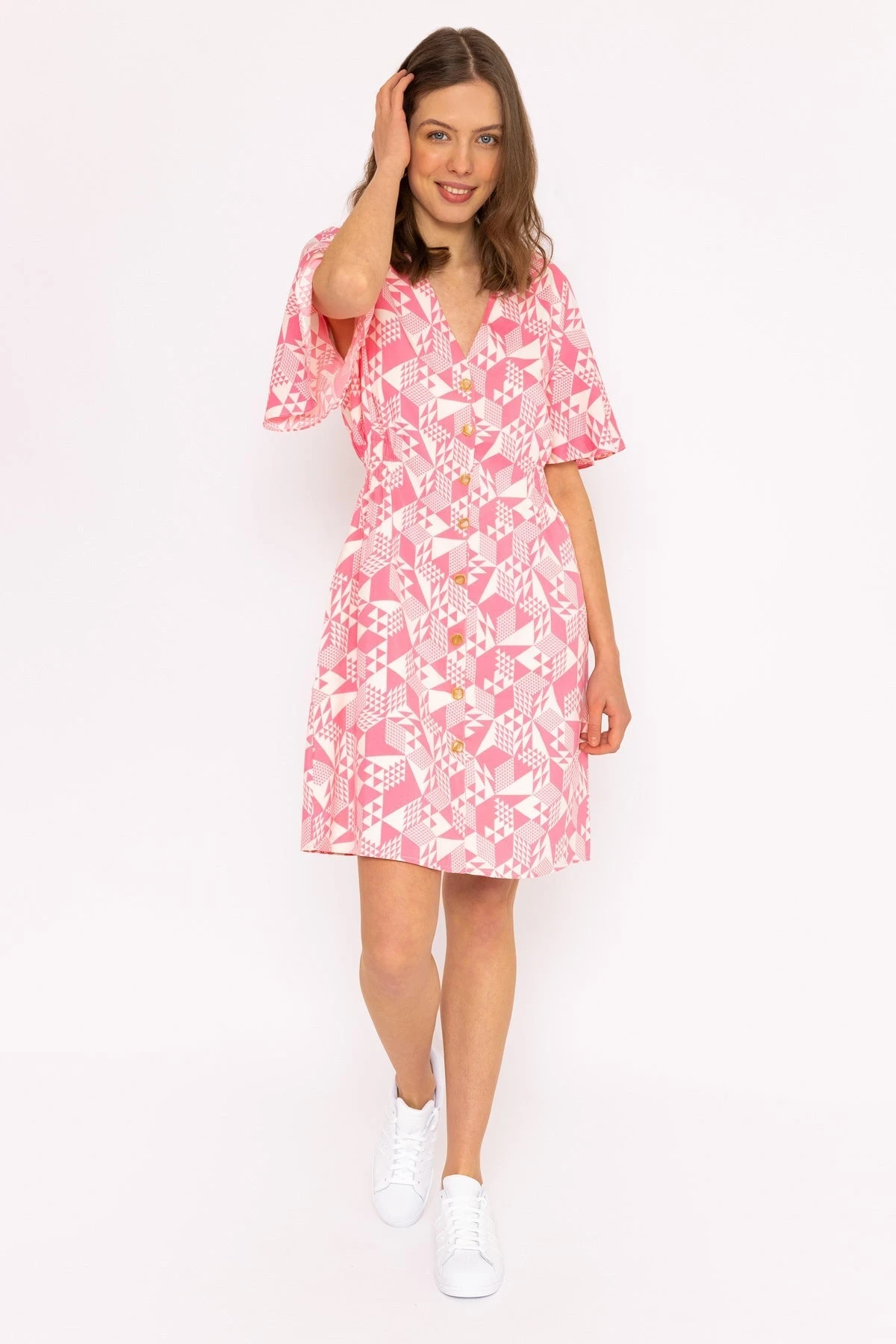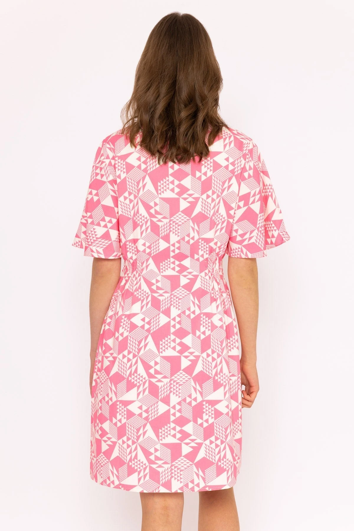 Short sleeved knee length dress in pink print by Rowen Avenue.