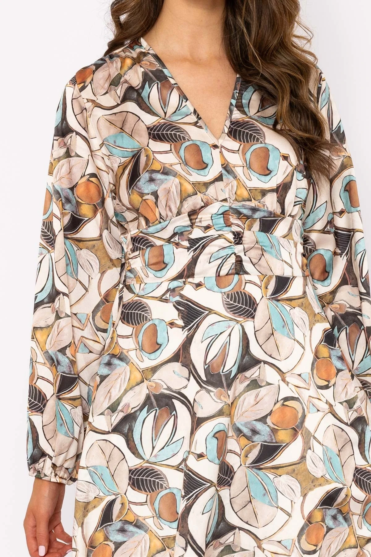 Beautiful cream printed long sleeved midi dress by Palo D’oro. This V-neck midi dress is the perfect comfortable occasion wear piece with an elasticated waist and pockets!