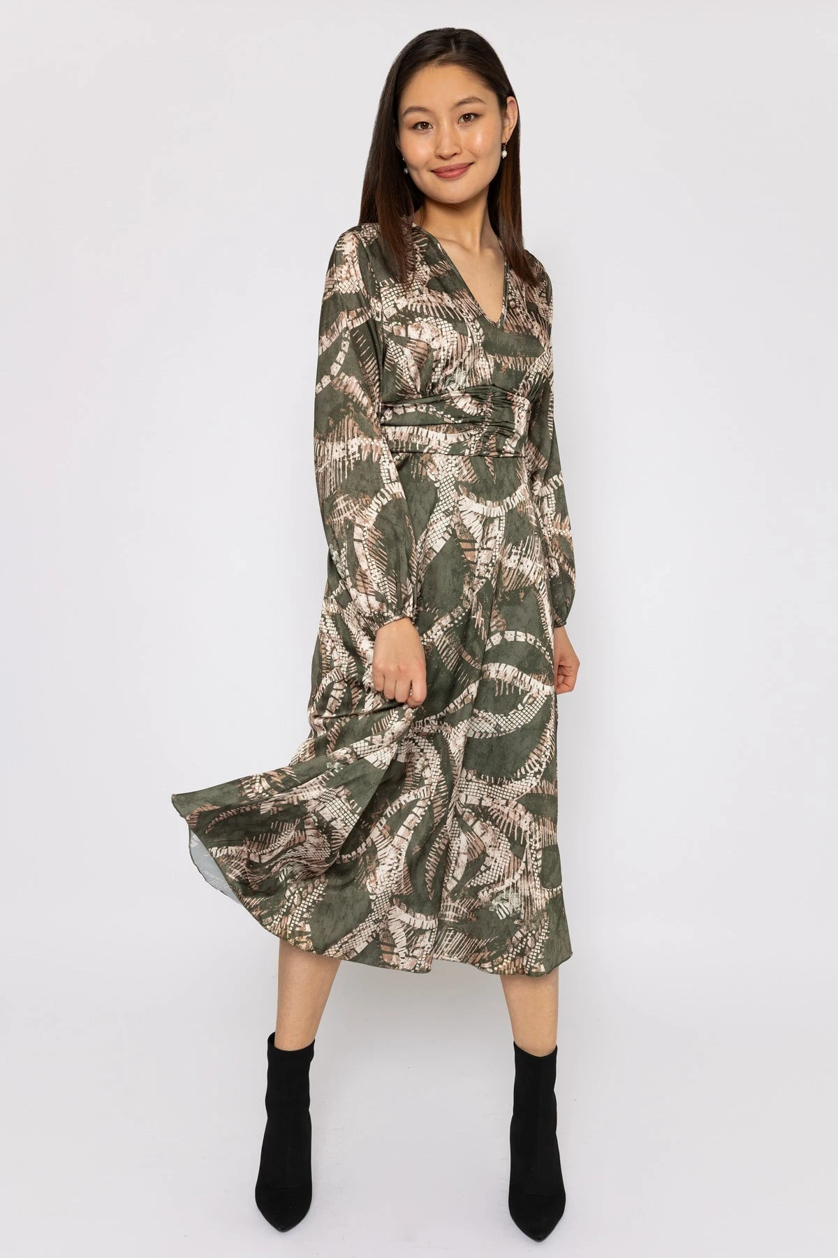 Beautiful khaki printed long sleeved midi dress by Palo D’oro. This V-neck midi dress is the perfect comfortable occasion wear piece with an elasticated waist and pockets!