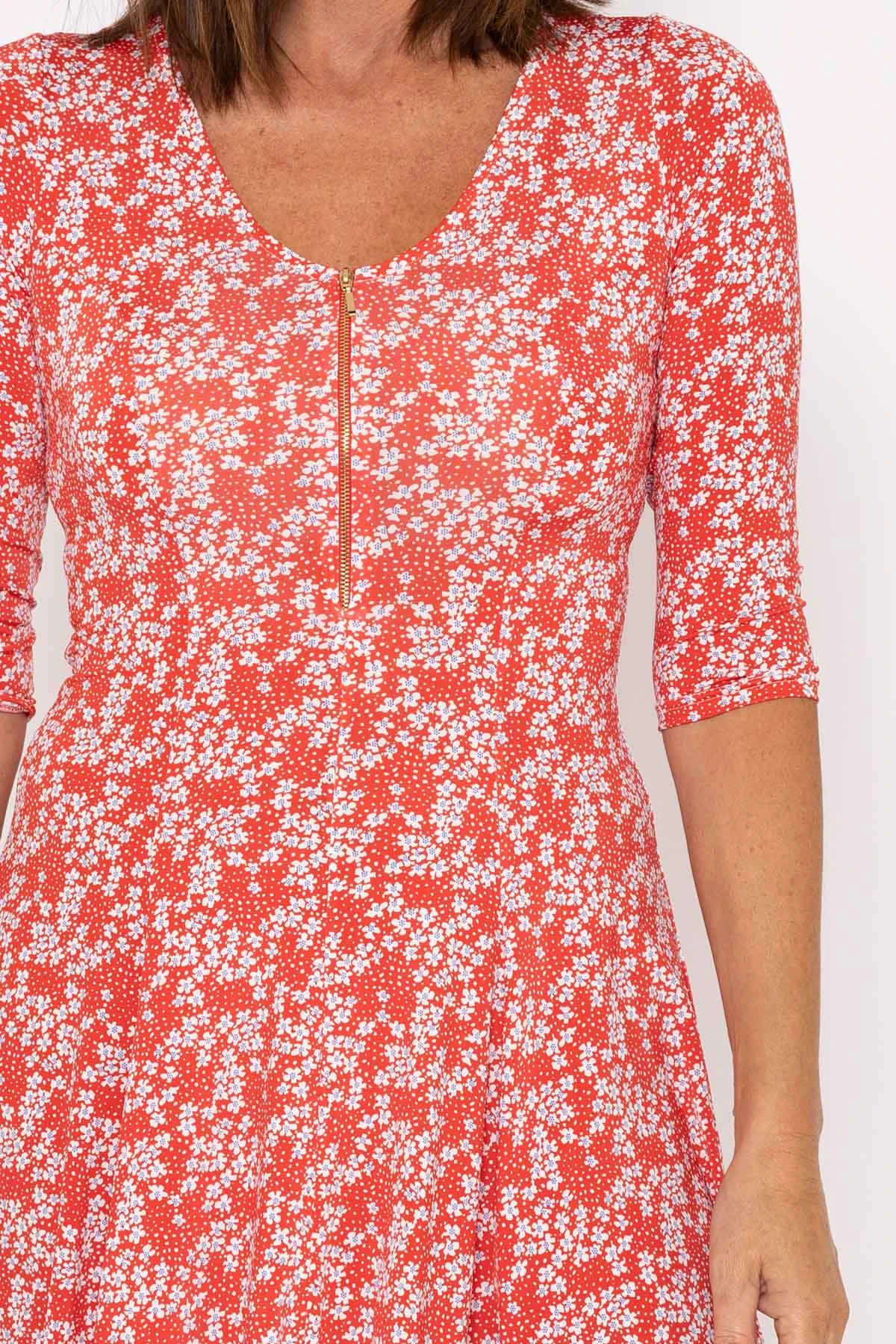 Aoife red printed dress by J’aime la Vie. This flattering cut dress in a travel friendly fabric requires no ironing and is a perfect holiday wardrobe addition.Â