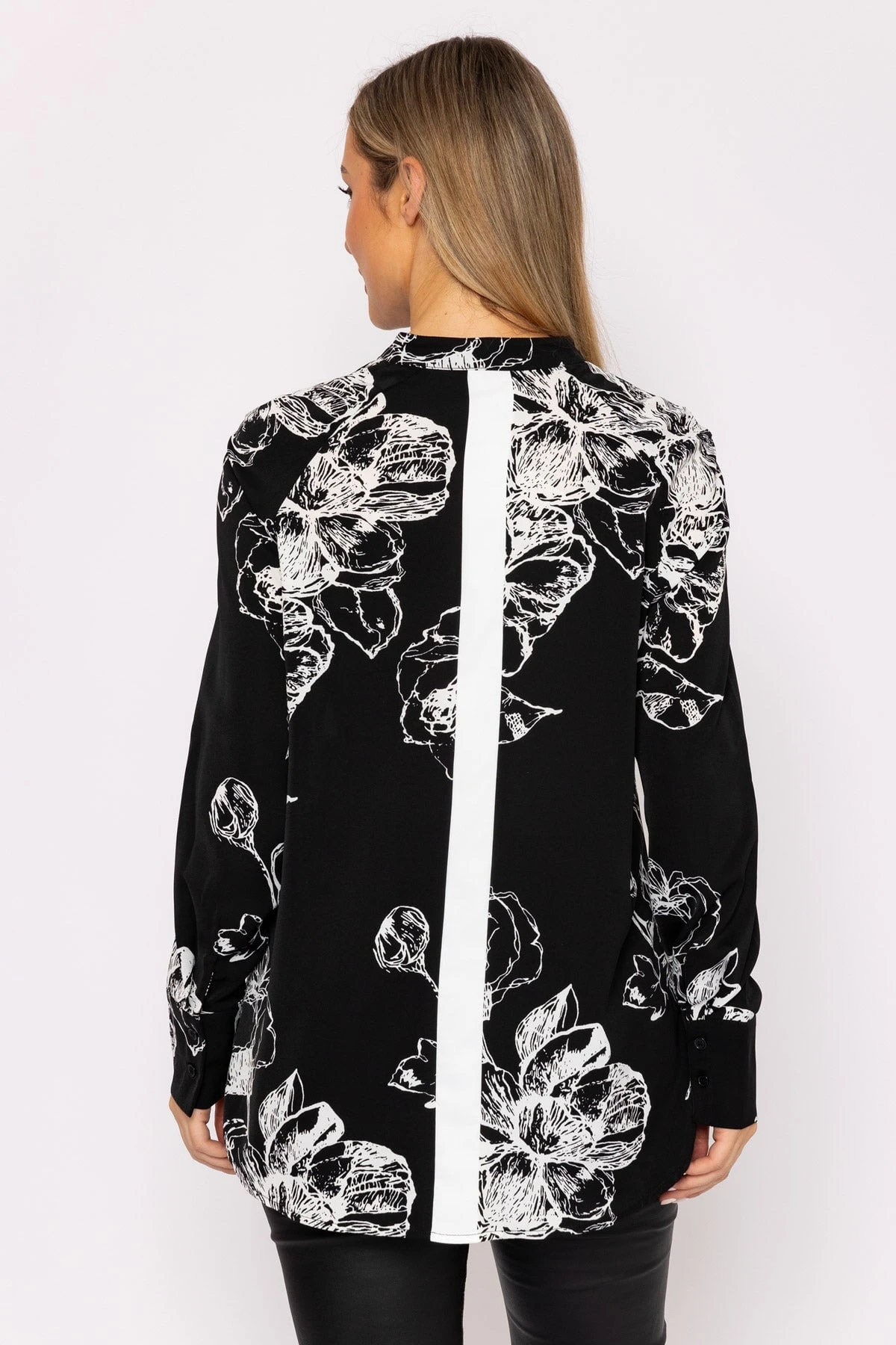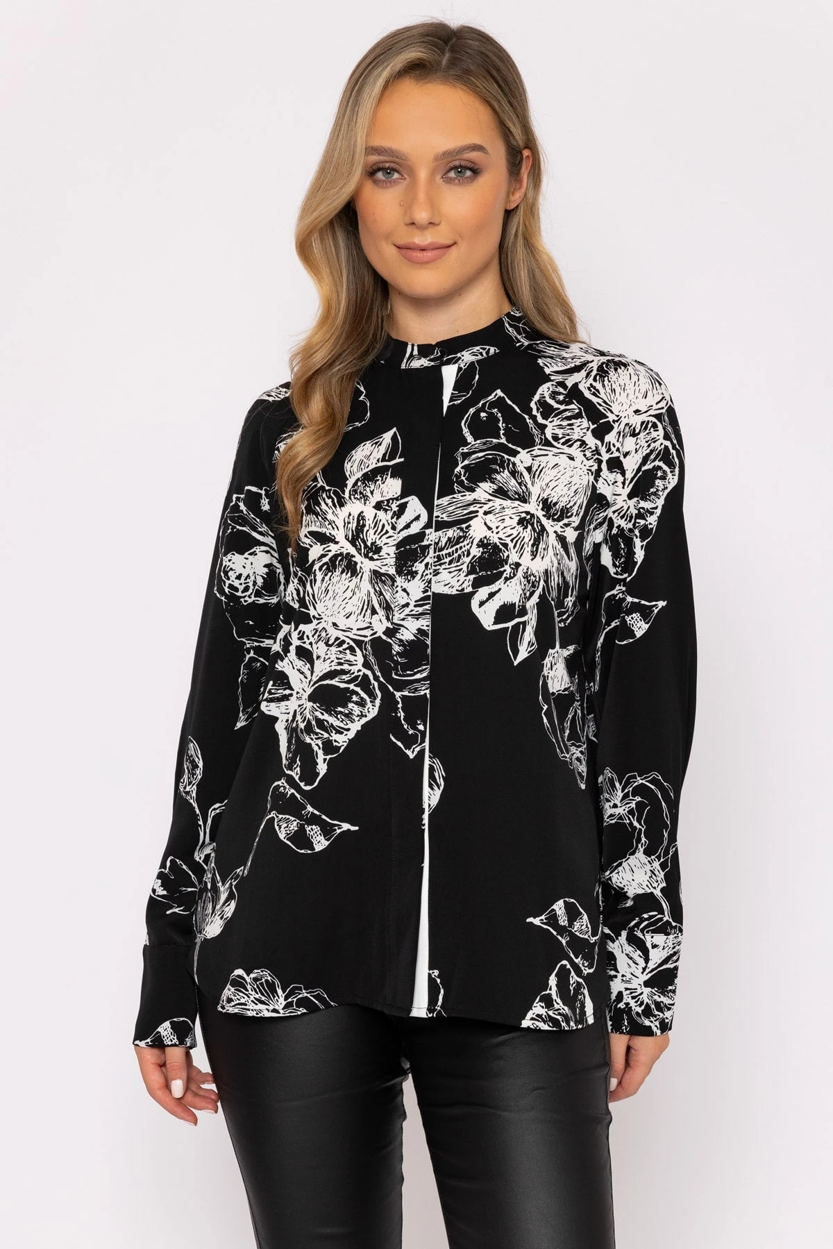 Long sleeve blouse in monochrome print by Rowen Avenue. Perfect for workwear comfort and style.Â