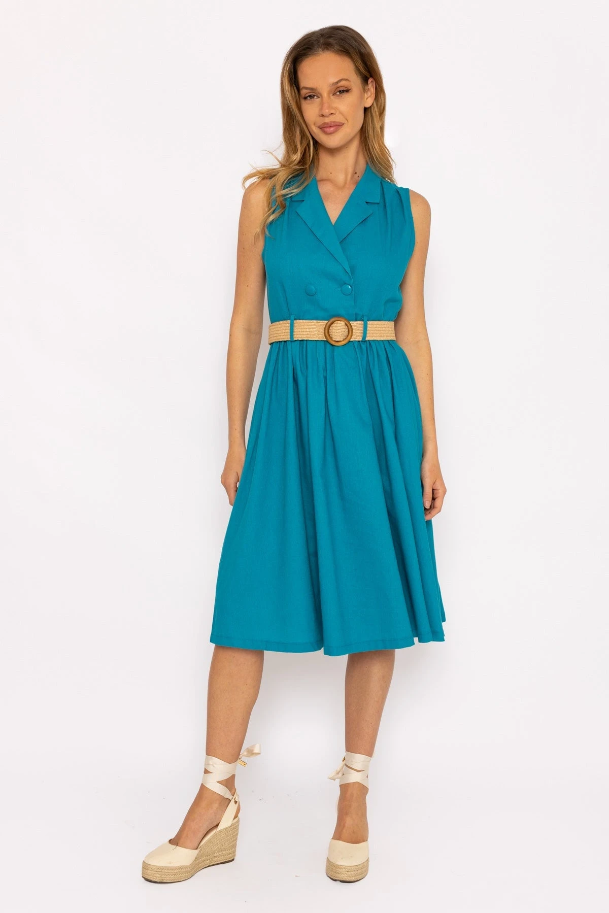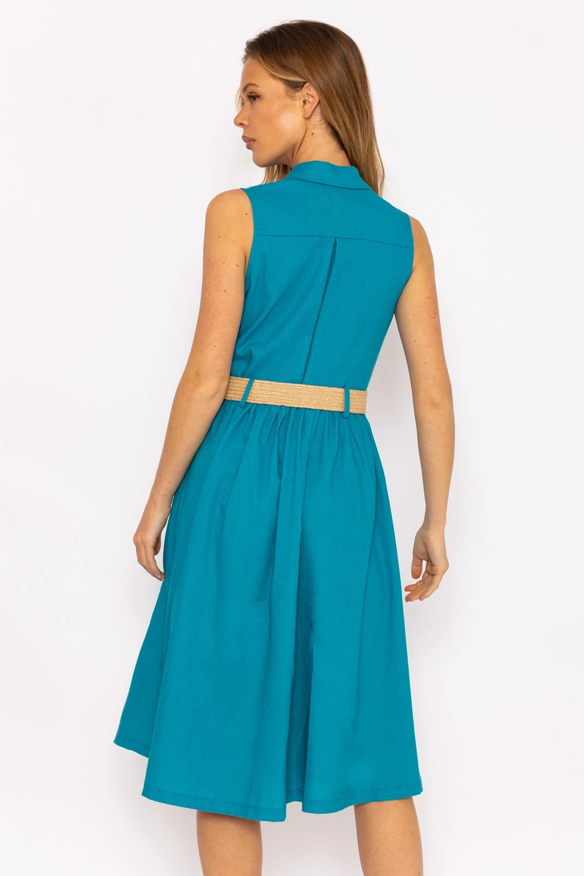 Teal blue belted linen shirt dress by Rowen Avenue. A versatile dress that can be styled for a special occasion or dressed down for casual wear.Â