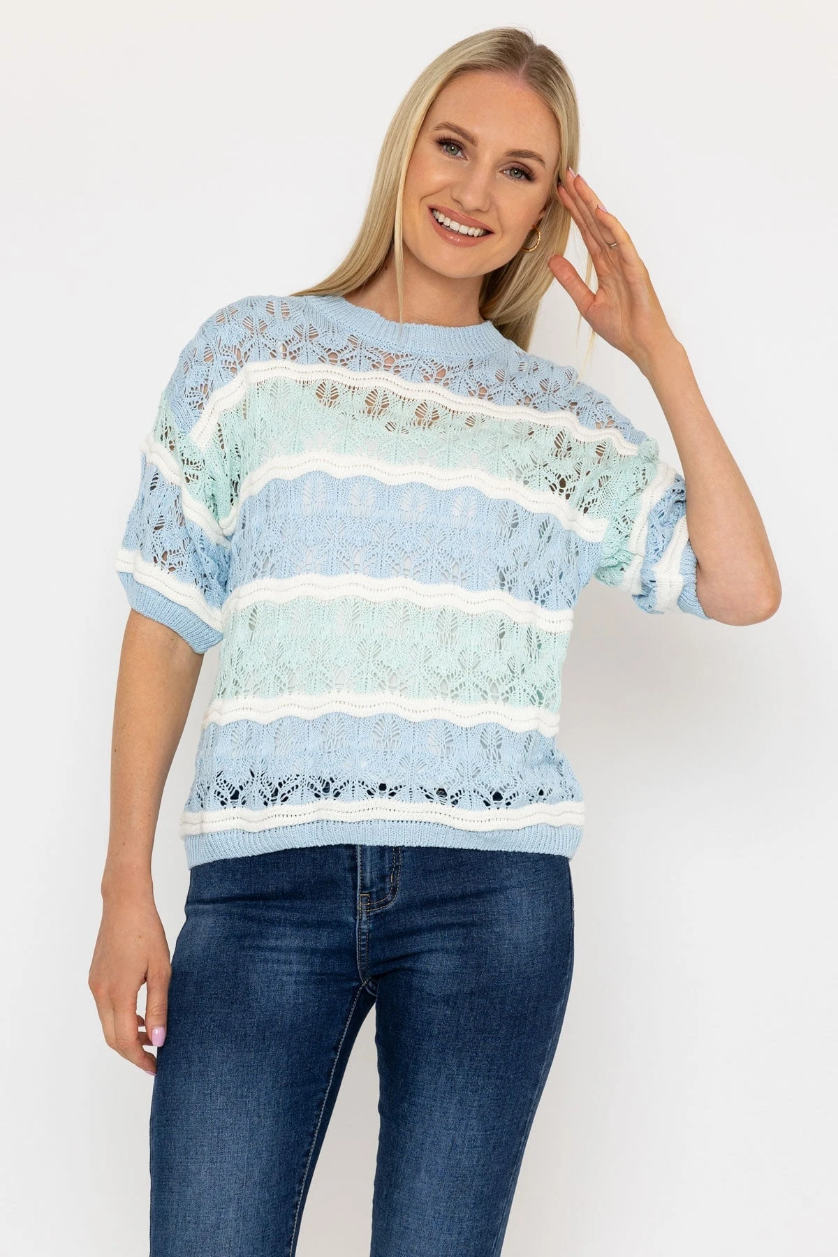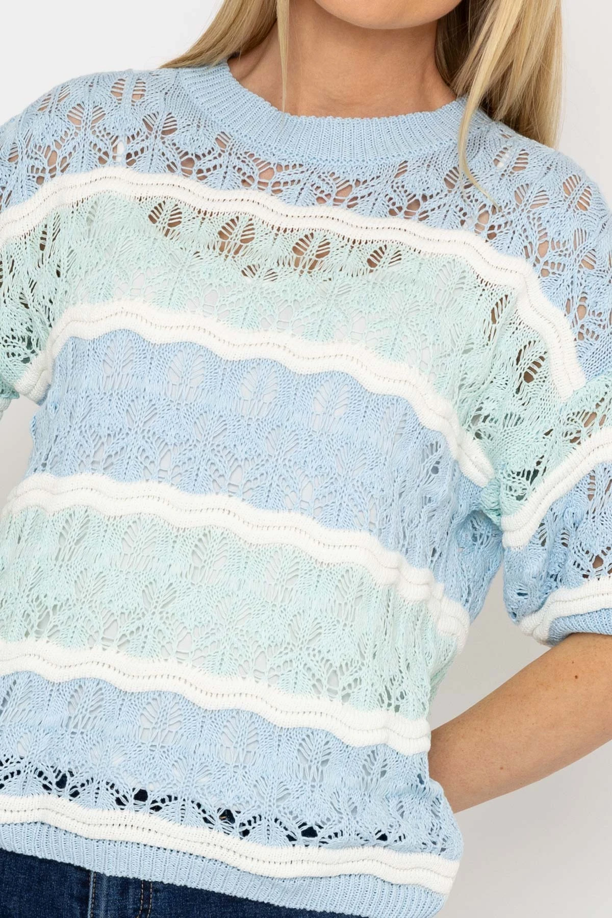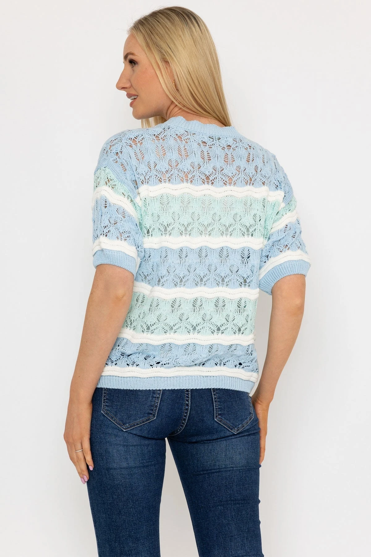 Ladies round neck knit in blue by Pala D’oro. Made for everyday wear. Super soft! Comfortable and easy to wear.