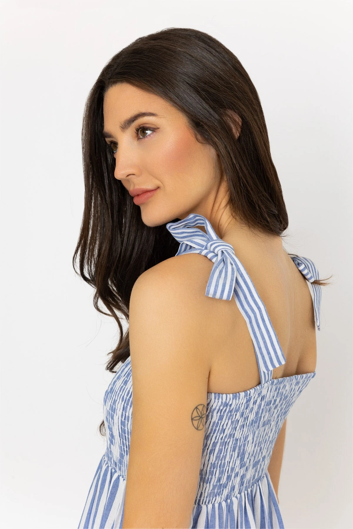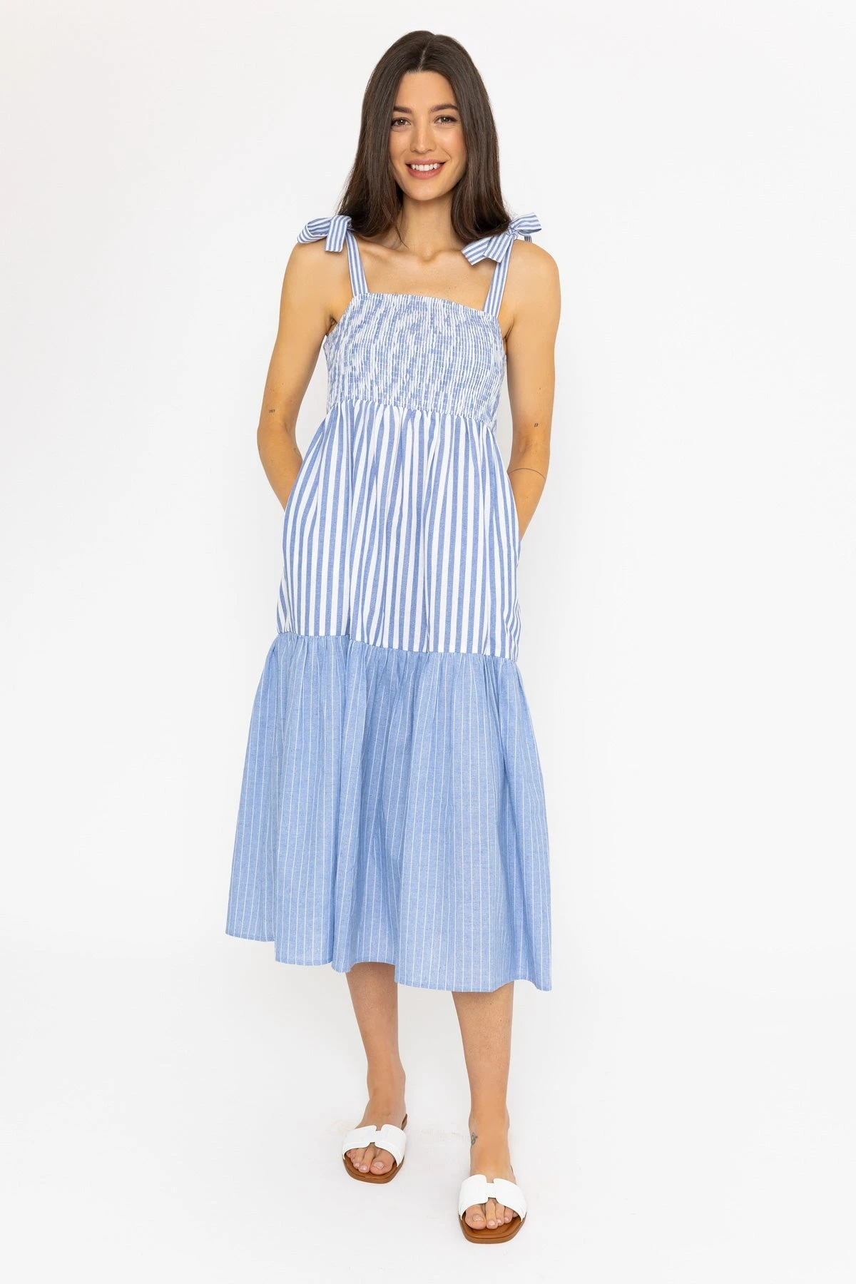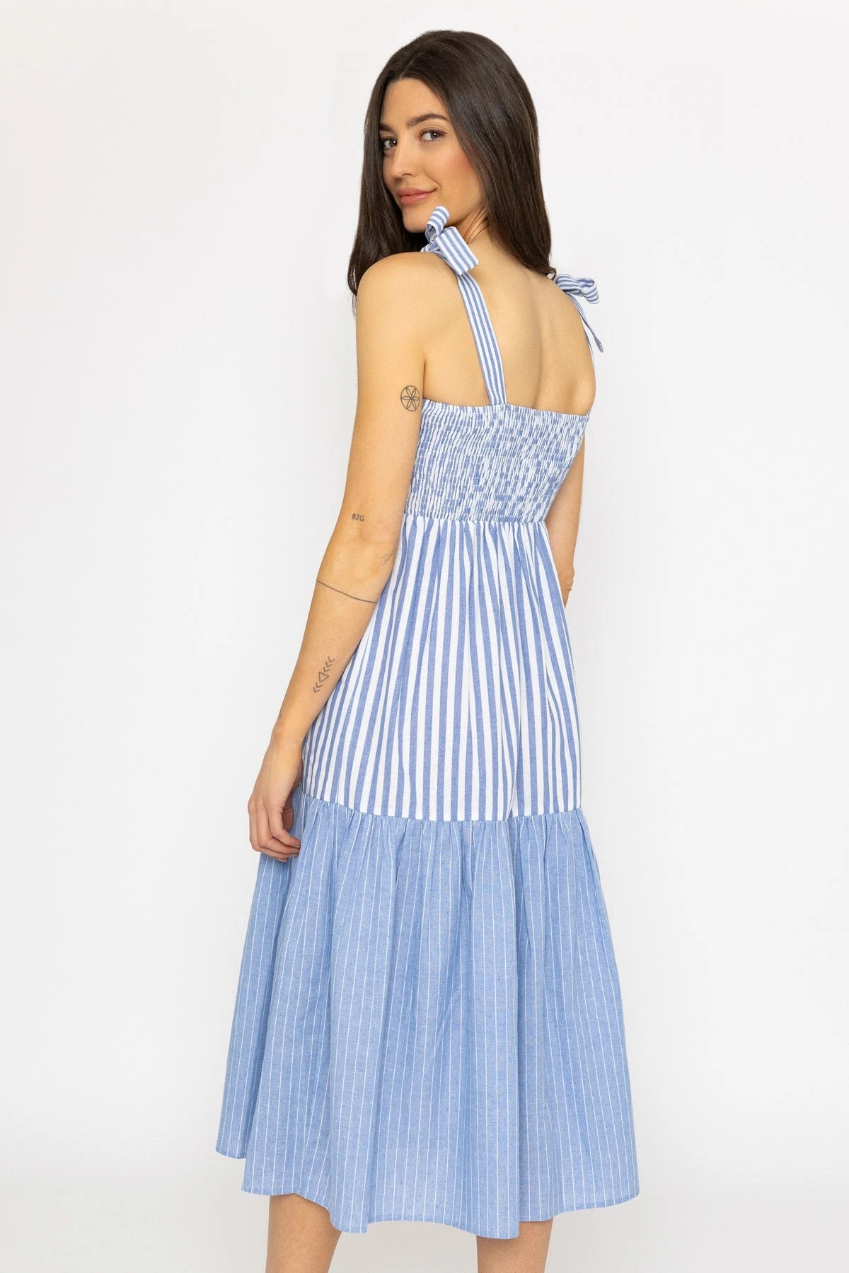 Blue Stripe Midi Dress by Rowen Avenue. The perfect summer dress for your next Summer holiday! With its flattering stripes, this versatile piece can be dressed up or down.Â