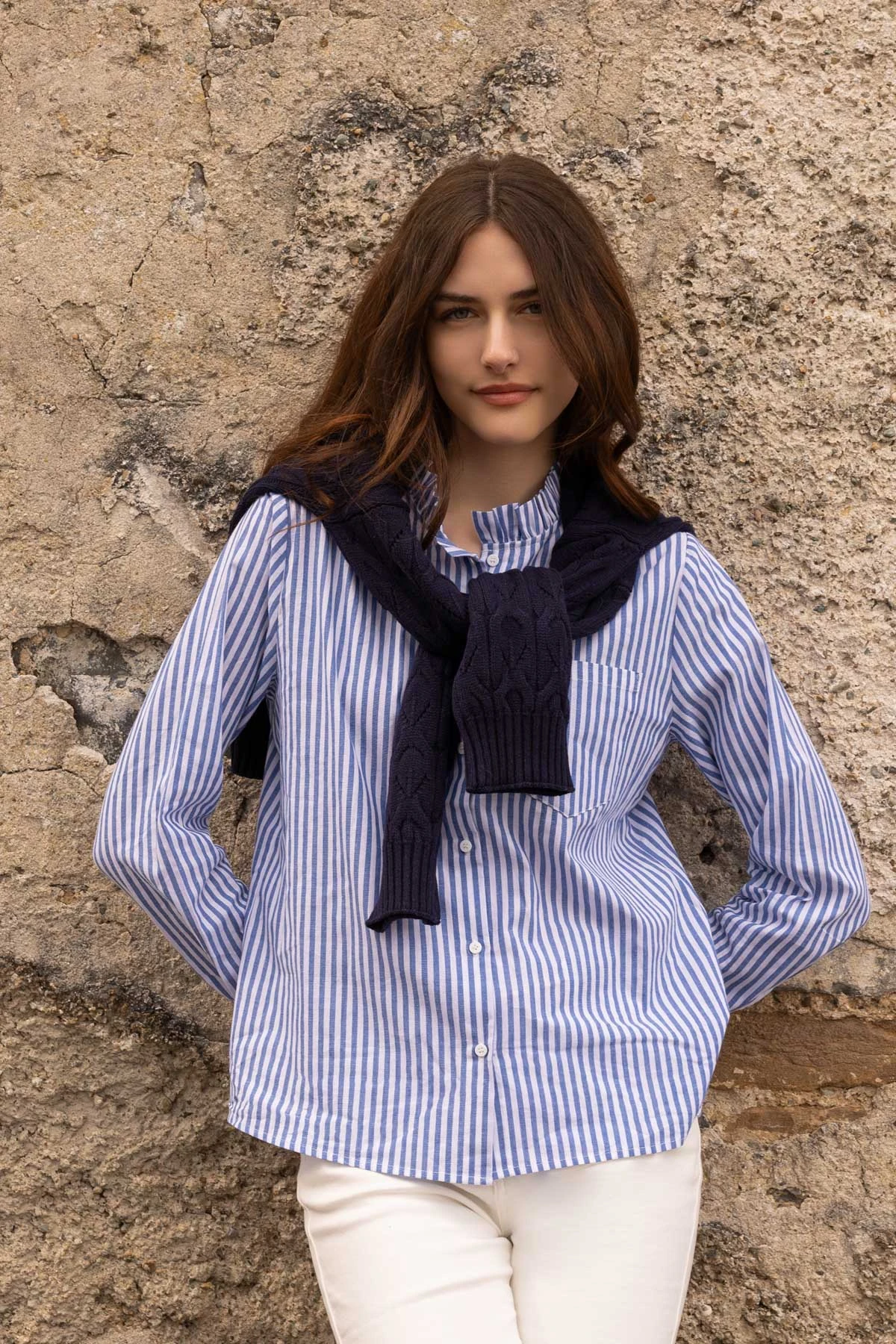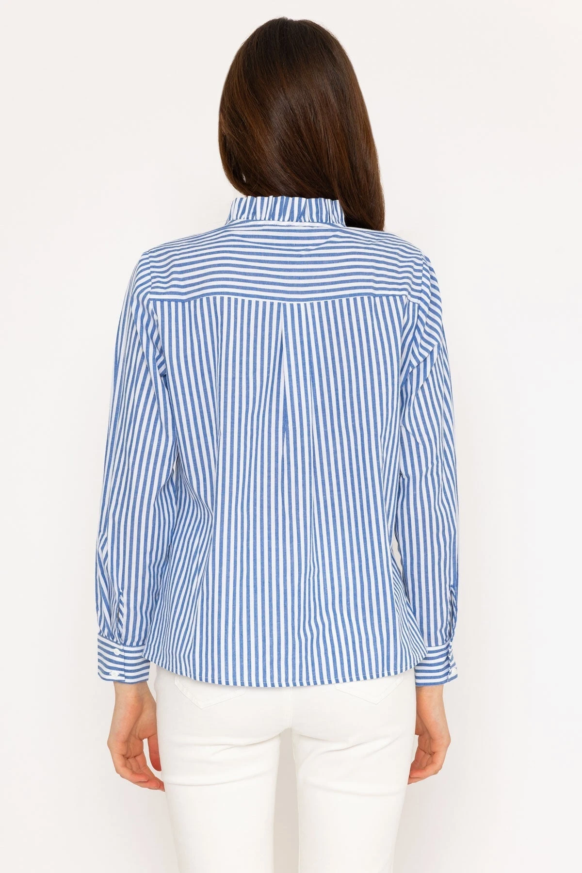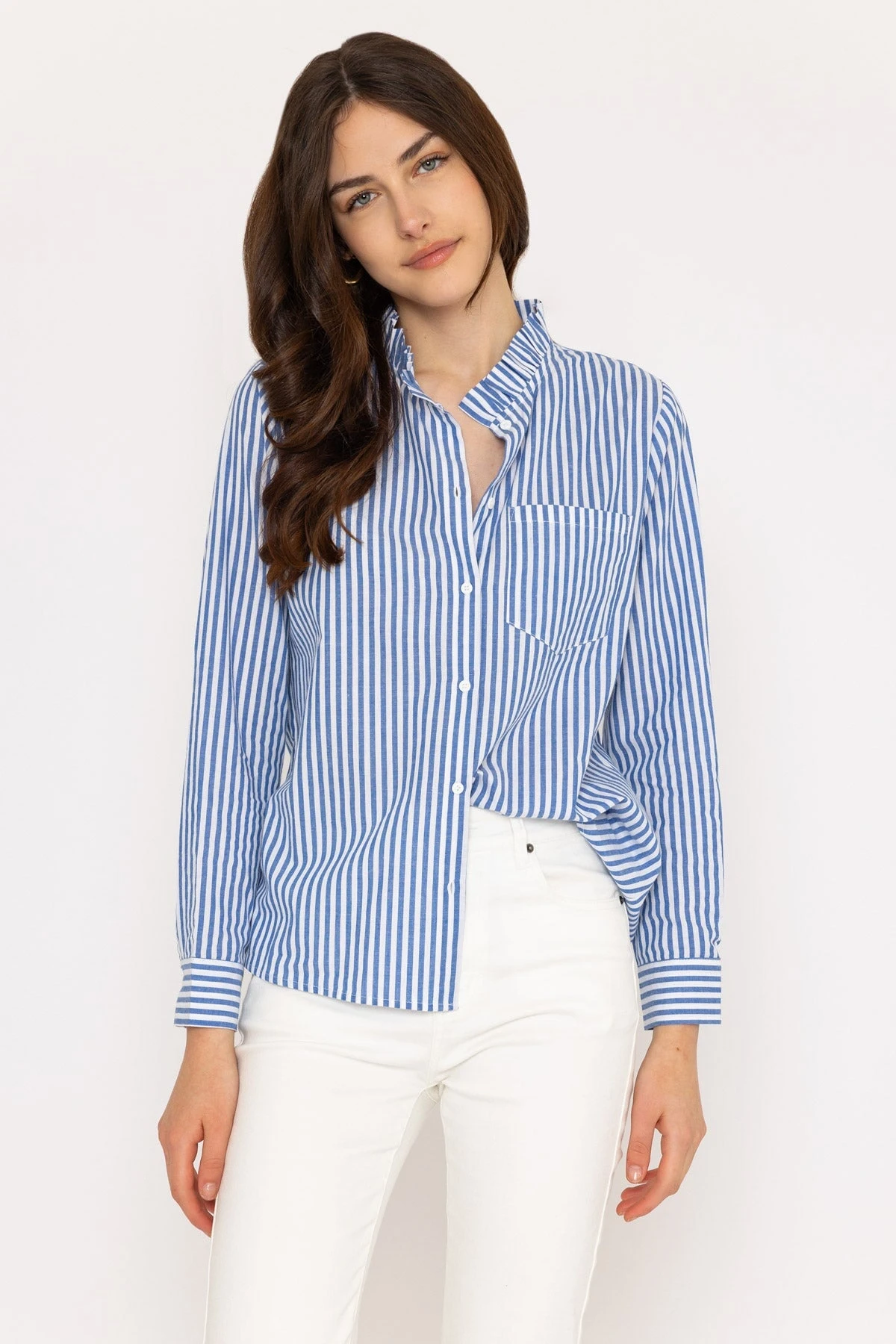 Blue Stripe Ruffle Shirt by Kelly & Grace Weekend. This ladies shirt can be dressed up or down for any occasion. Elevate your style with its delicate ruffle detailing.Â