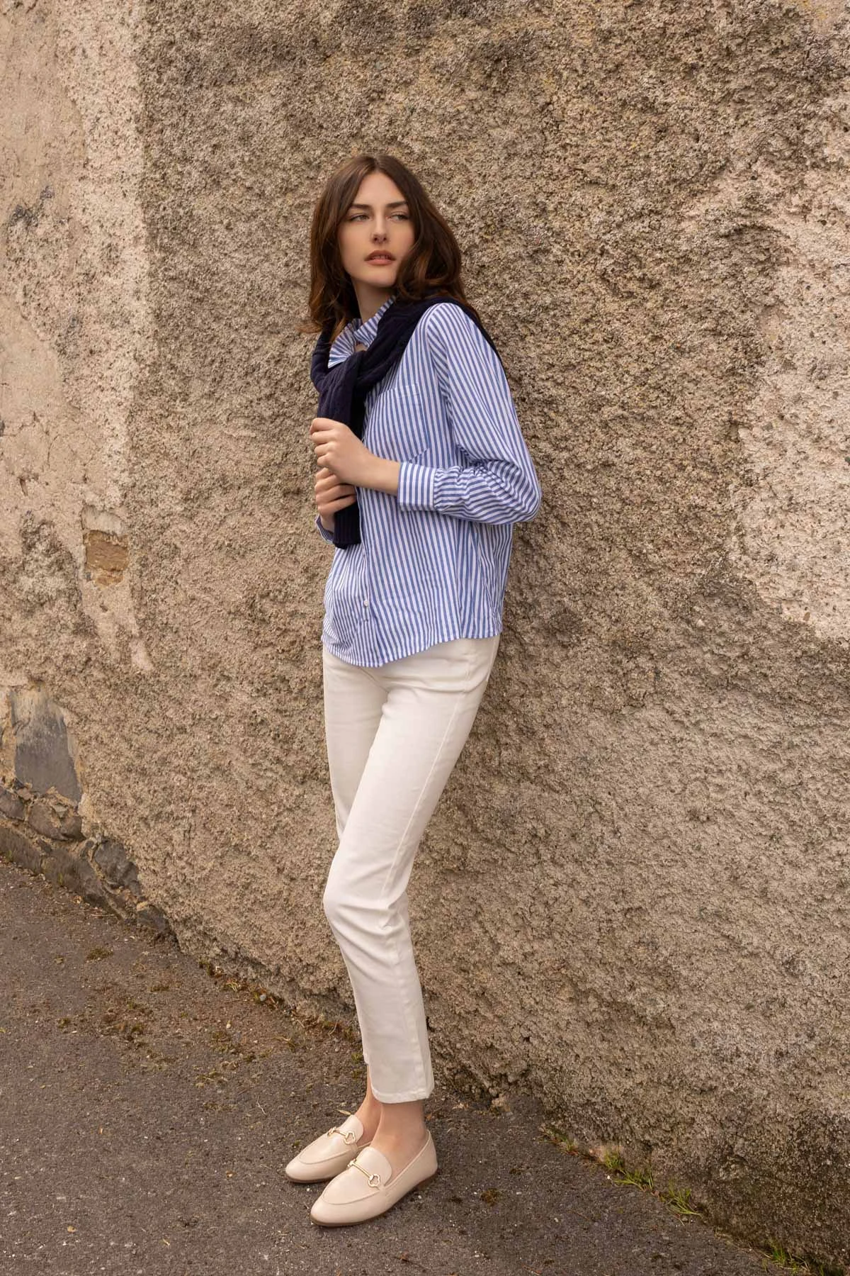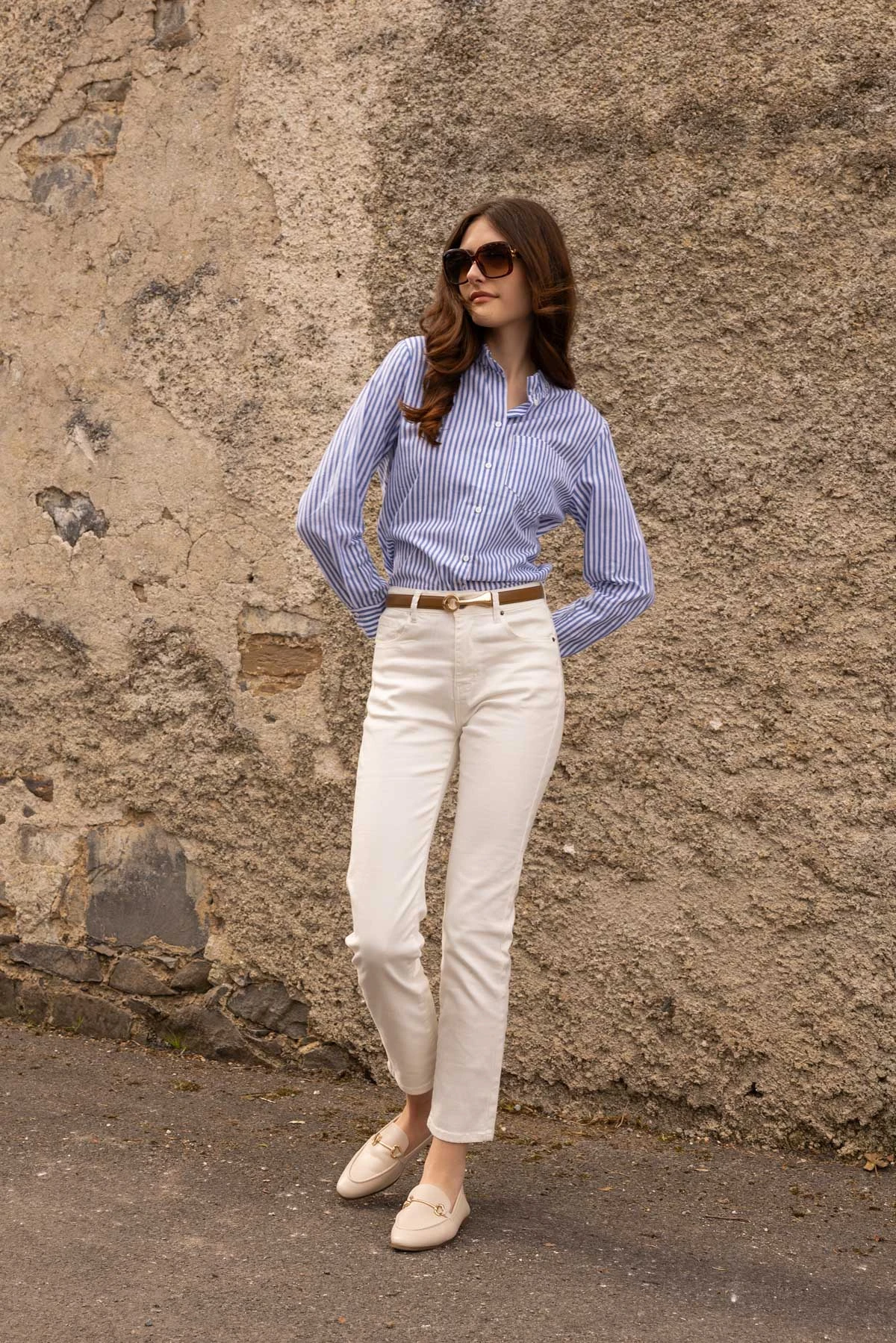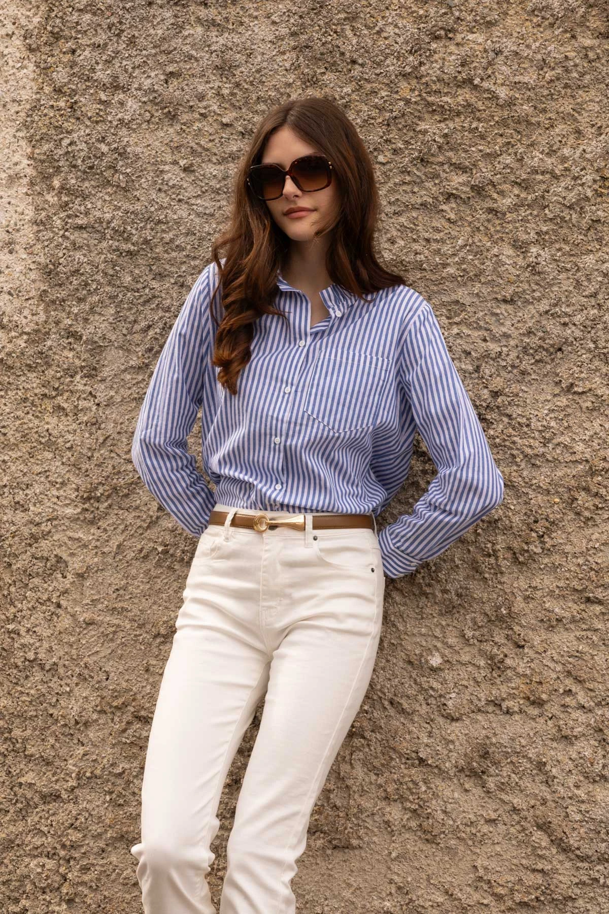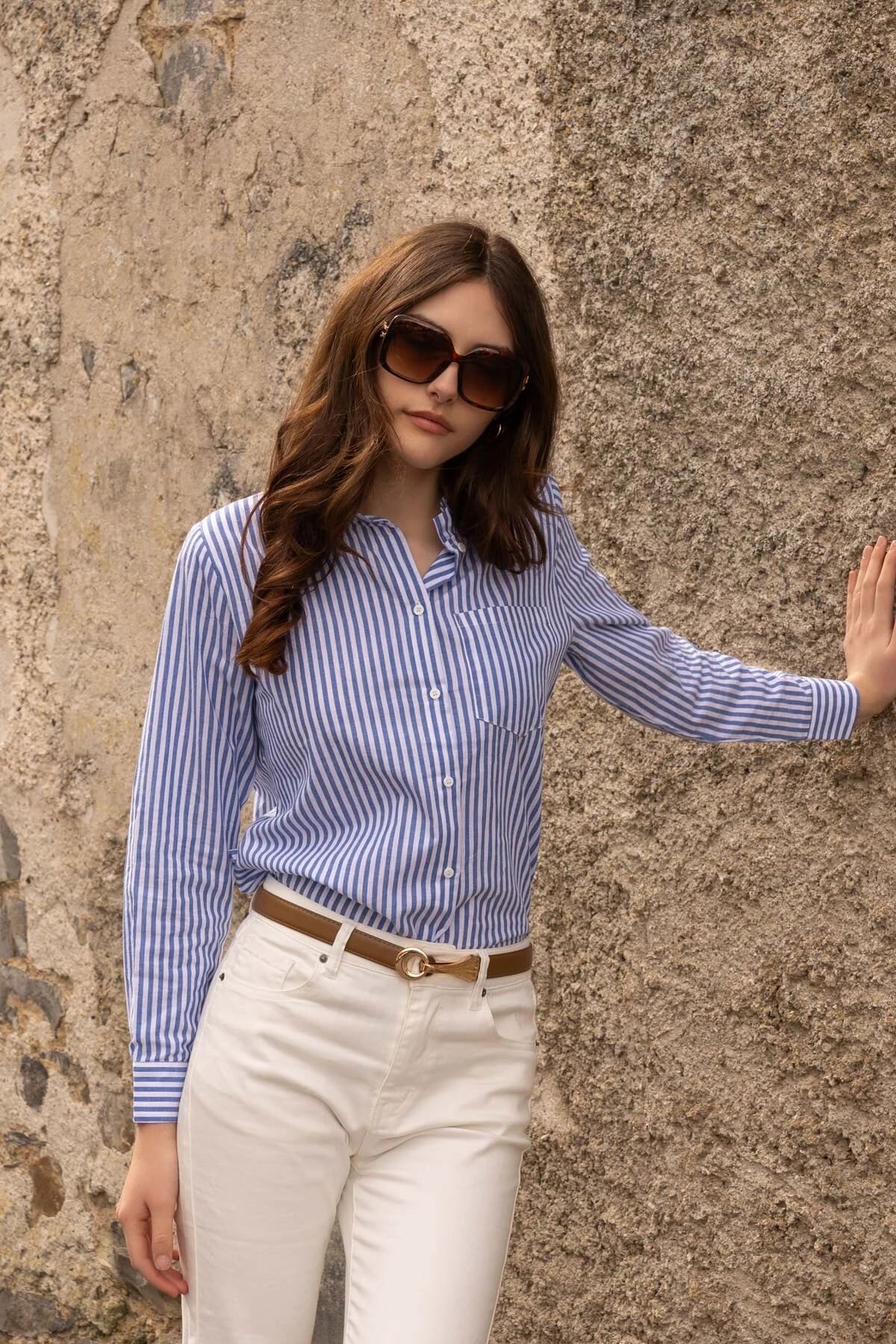 Blue Stripe Ruffle Shirt by Kelly & Grace Weekend. This ladies shirt can be dressed up or down for any occasion. Elevate your style with its delicate ruffle detailing.Â