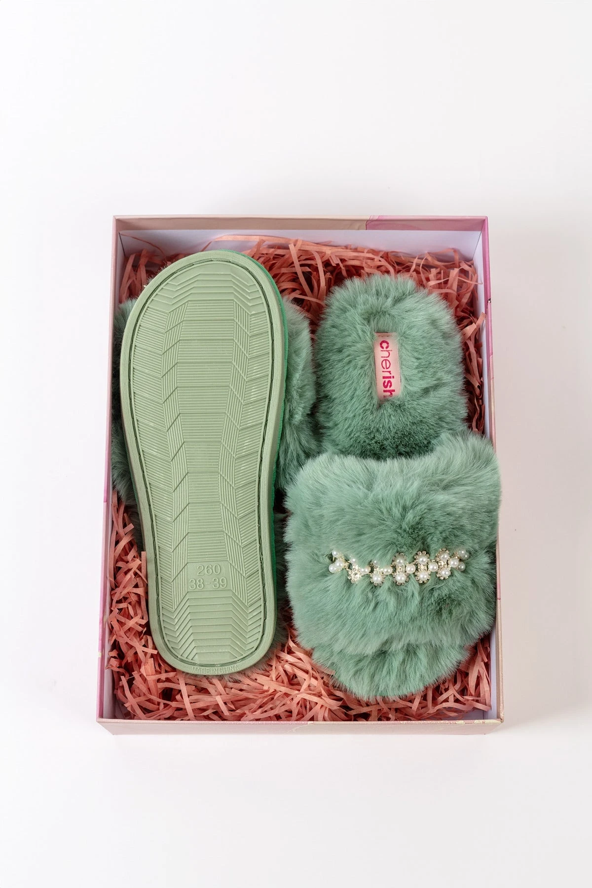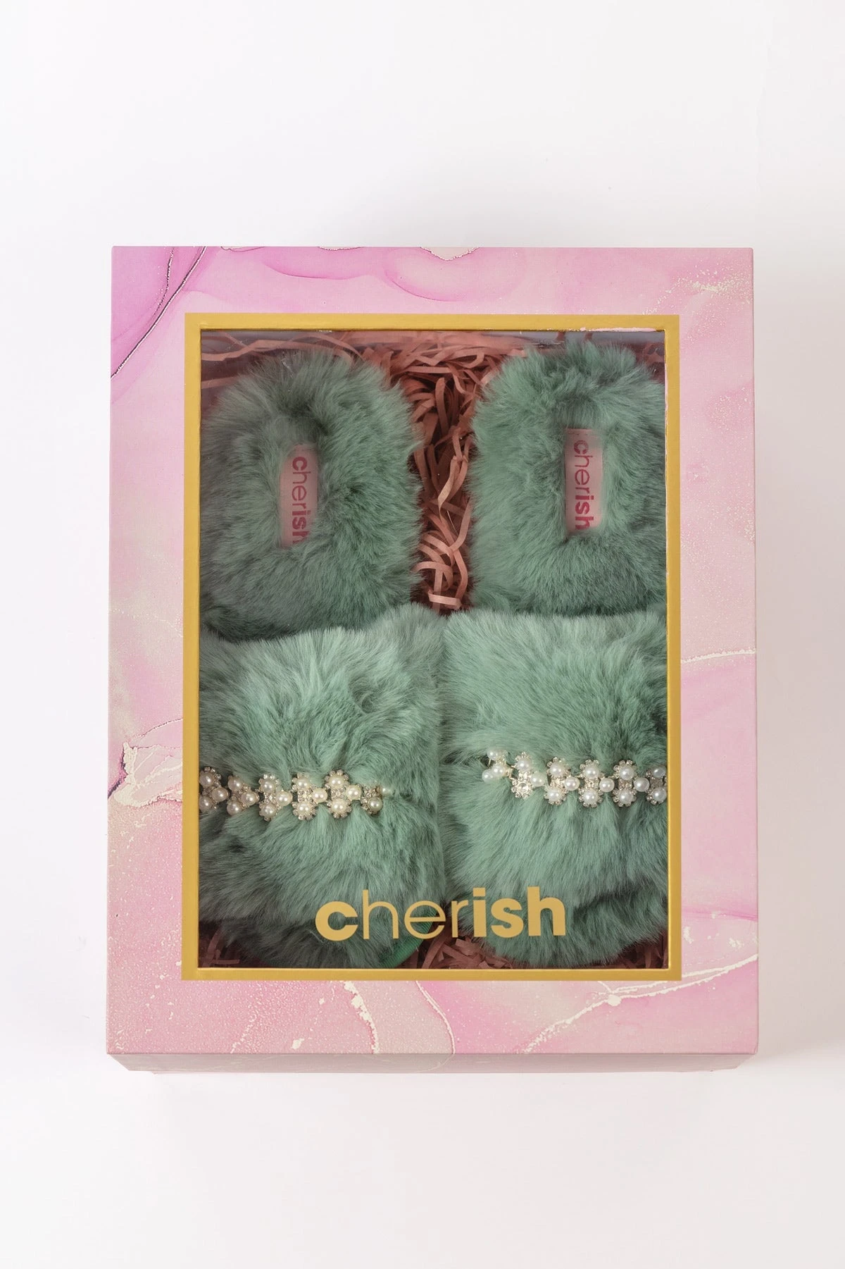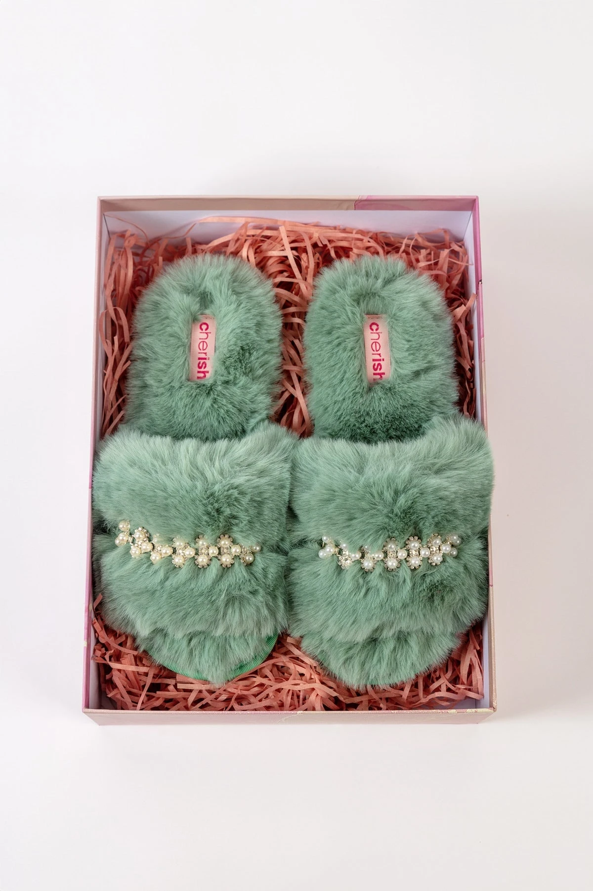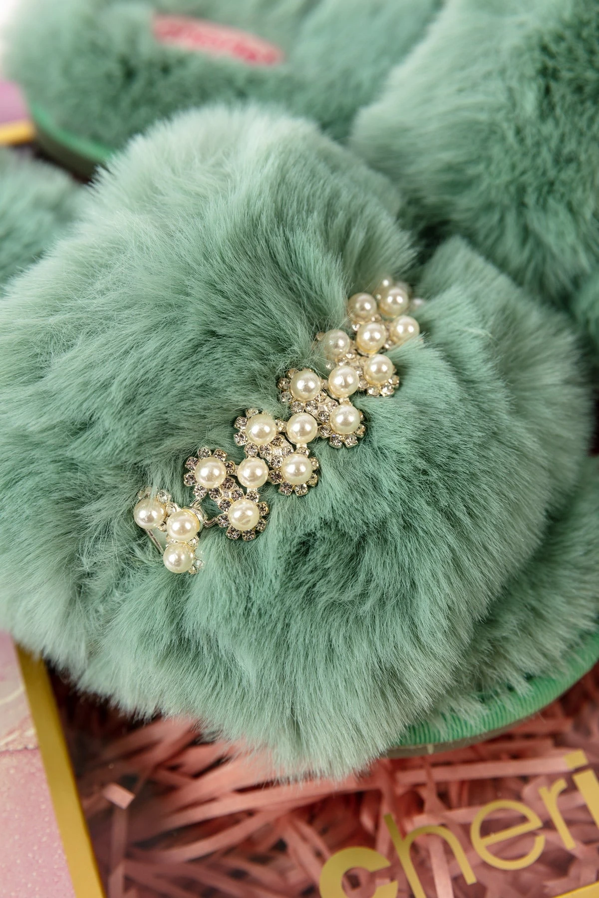 Boxed Embellished Slippers in Green by Cherish Accessories.