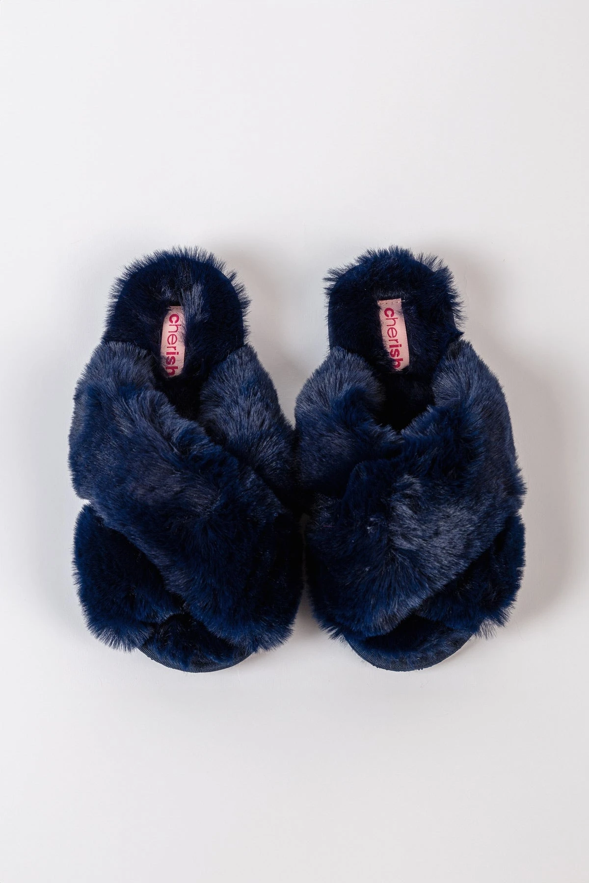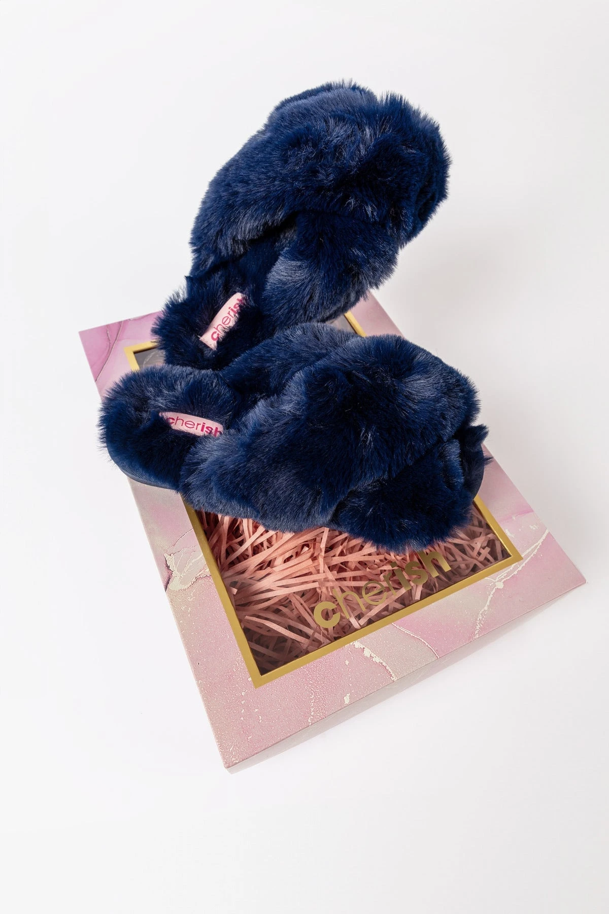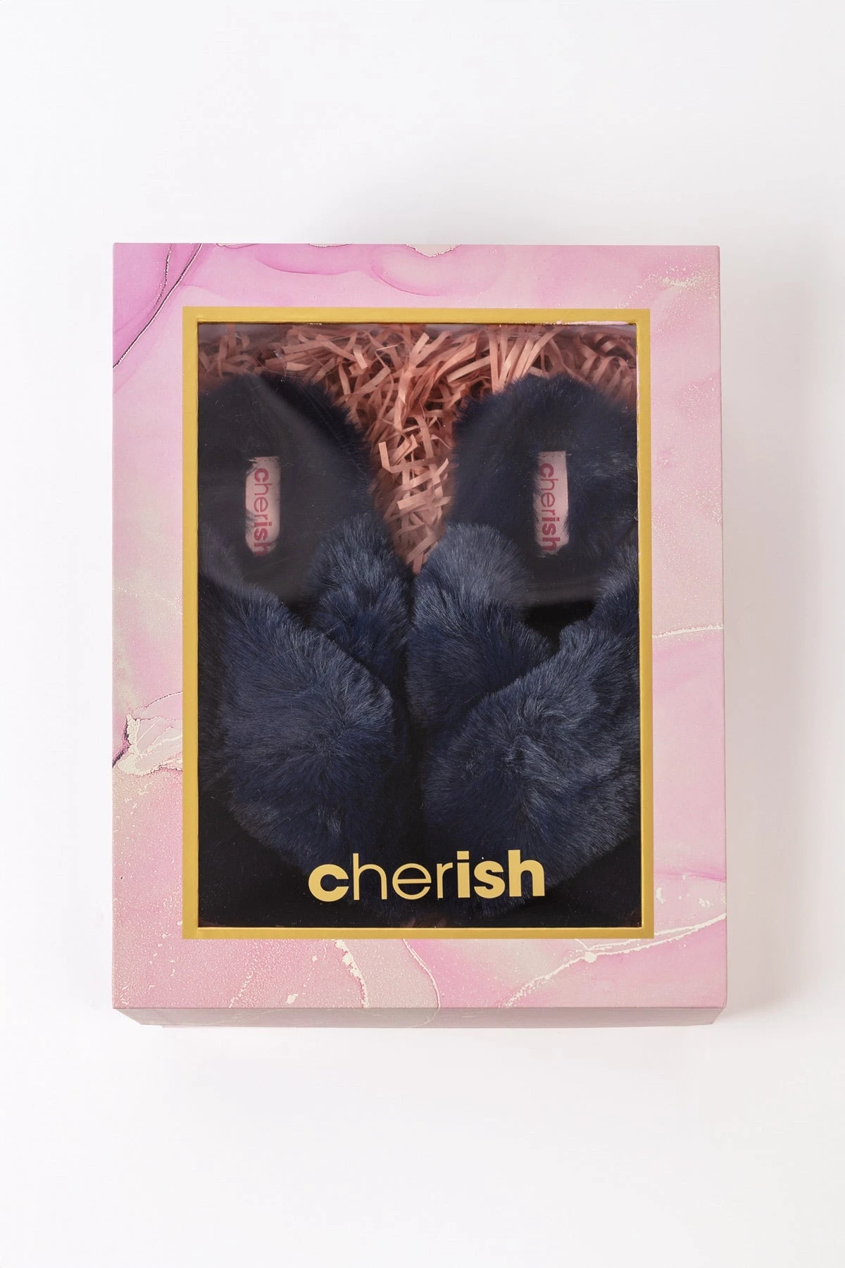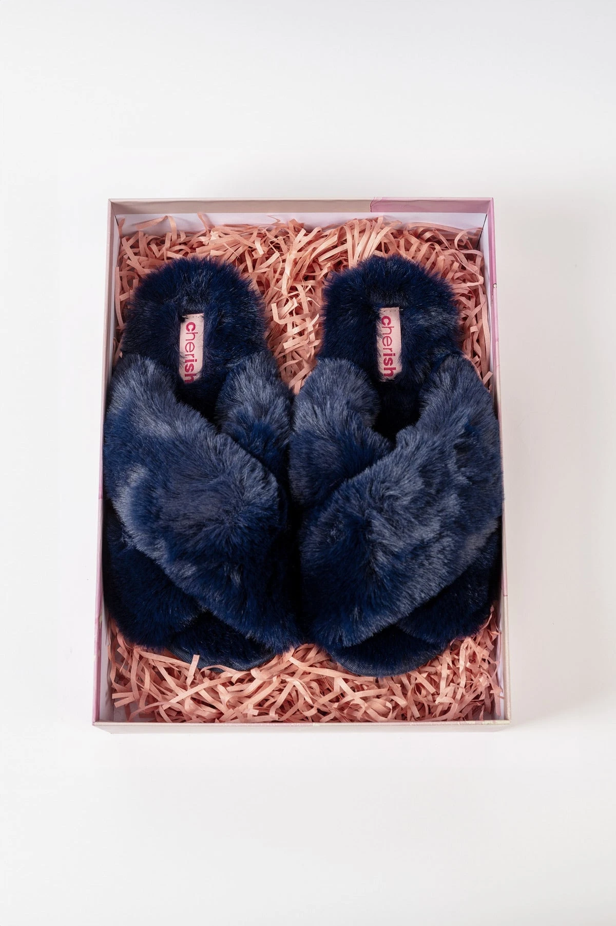Boxed Faux Fur Quilted Slippers in Navy by Cherish Accessories.
