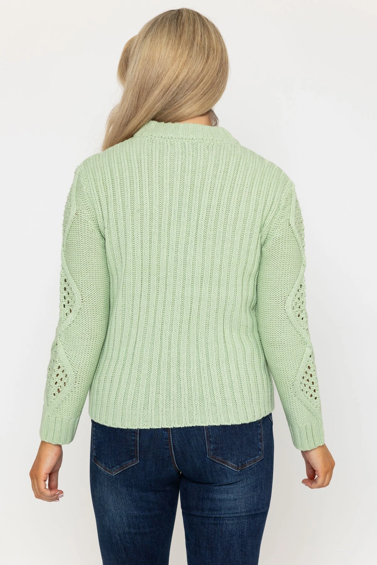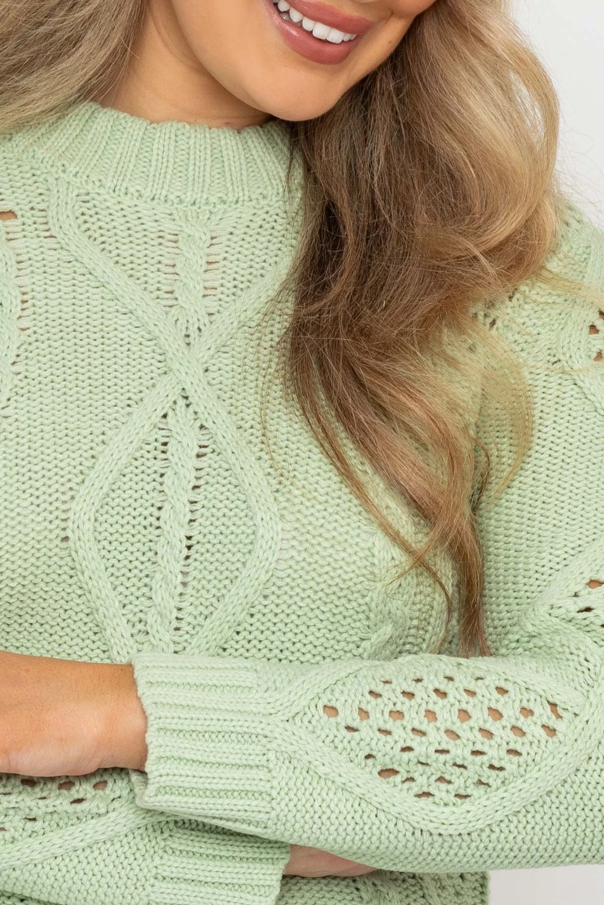 Cable knit crew neck by Grace and Kelly Weekend. Made with a classic cable knit design, this ladies green knitted jumper is the perfect addition to any wardrobe. Perfect for braving the cold weather, this knitted sweater will keep you warm and stylish.