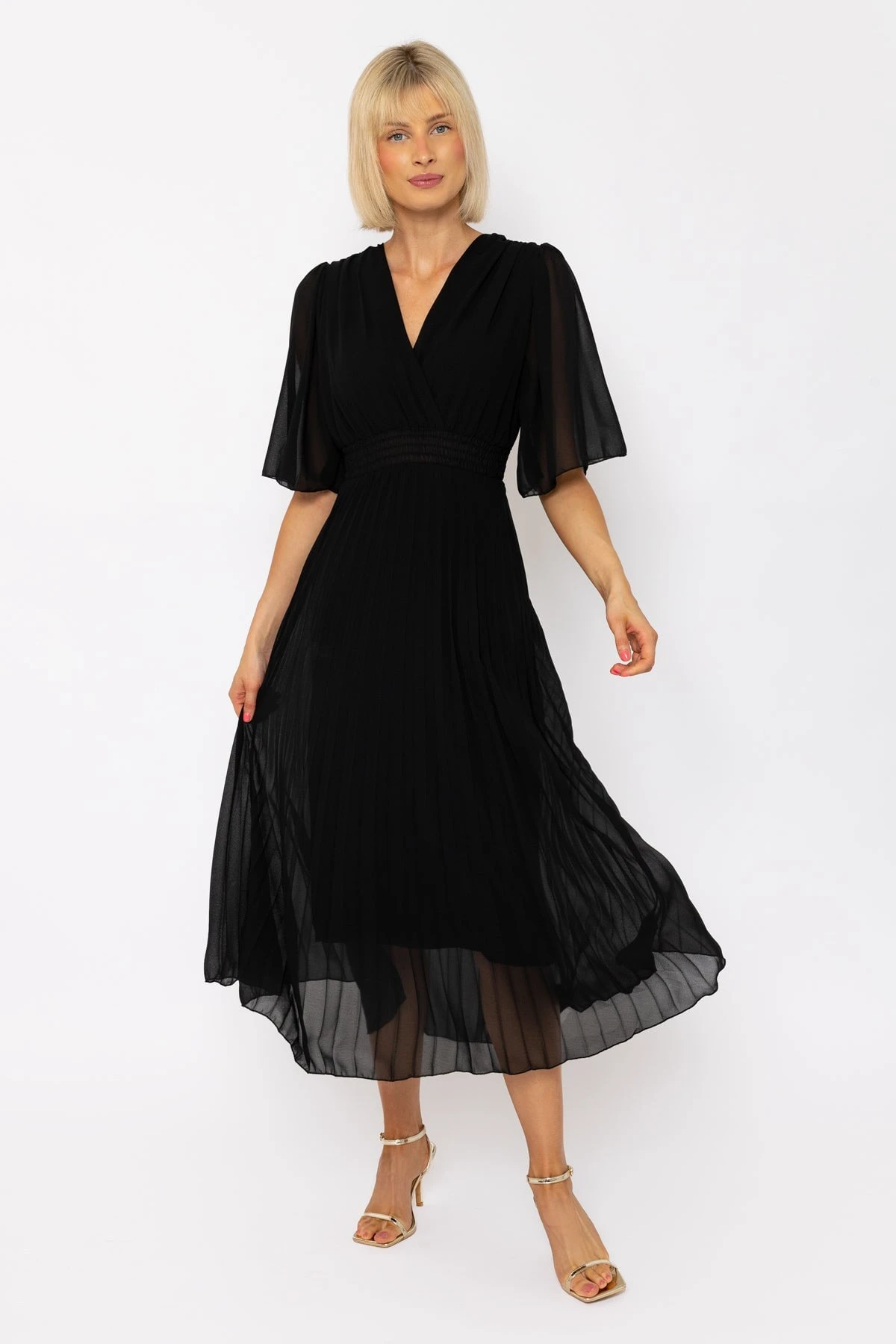 Black pleated midi dress by Palo D’oro.