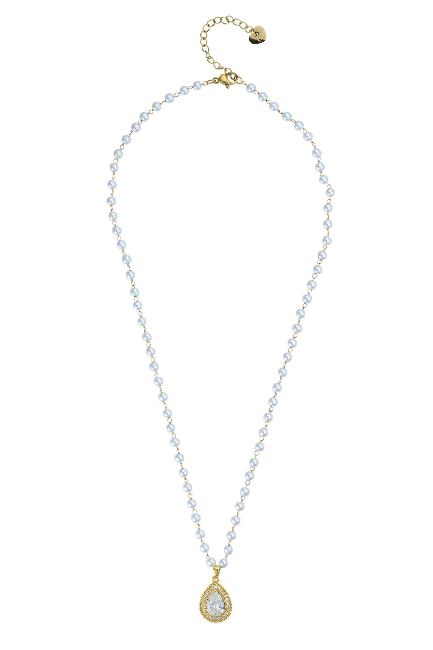 Chaya Faux Pearl Gold Necklace by Knight & Day. Elegant faux pearl necklace with crystal teardrop. Perfect for both formal and casual events, this ladies pearl necklace is sure to make a statement and elevate your entire look.