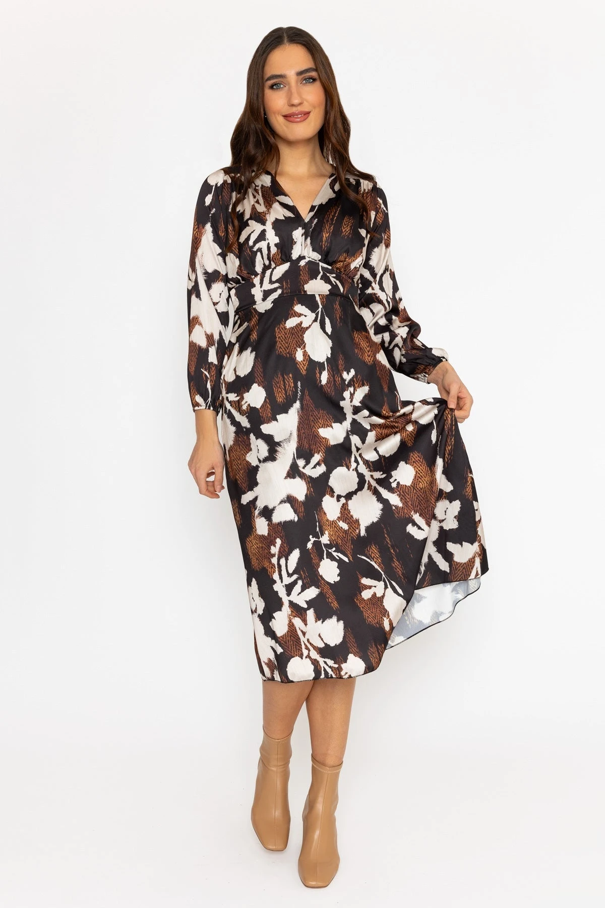 Long sleeved midi dress in brown print by Pala D’oro. Perfect for any occasion. This stunning midi dress boasts an eye-catching print that is sure to turn heads. With its flattering silhouette and comfortable fit, it’s the perfect choice for any occasion.