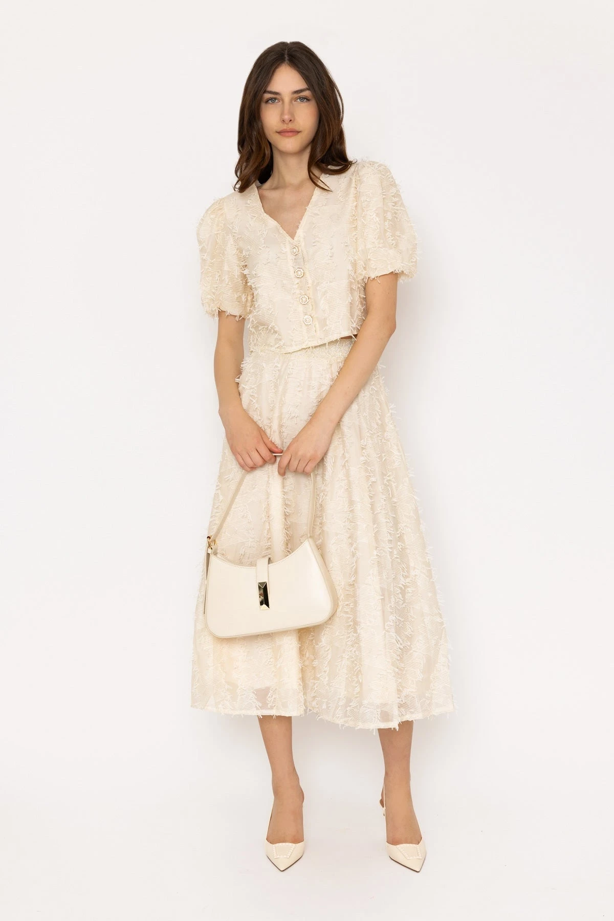 This stunning Cream Tulle Midi Skirt is a must-have for any fashion lover. Its airy fabric and midi length make it perfect for any occasion. Dress it up with heels for a formal event or pair it with sneakers for a more casual look. Versatile and stylish, this skirt will be a staple in your wardrobe.