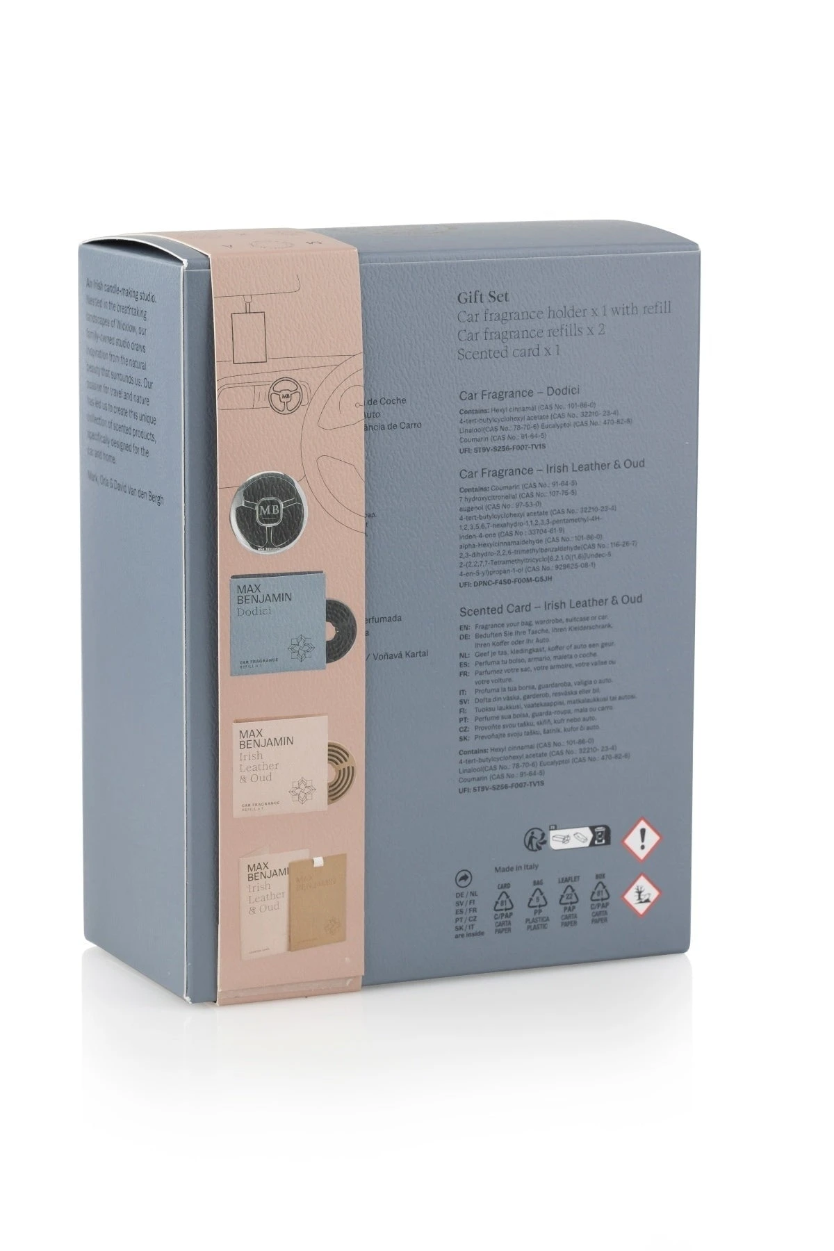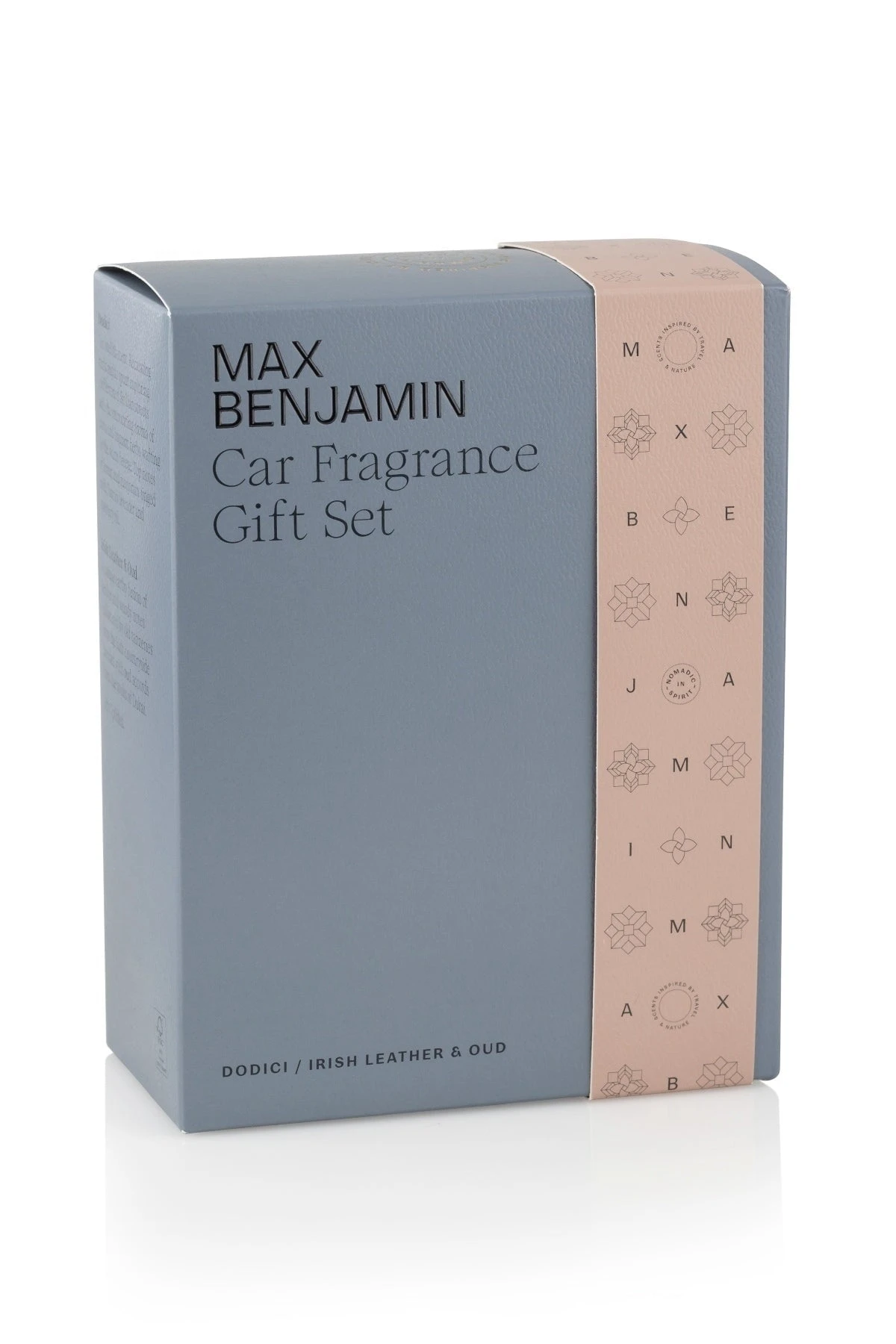 The perfect gift for Him, a car fragrance set from Irish Brand Max Benjamin. 1 Car fragrance dispenser with refill in Dodici with 1 car refill,1 Irish Leather Oud car refill,1 Irish Leather & Oud scented card.