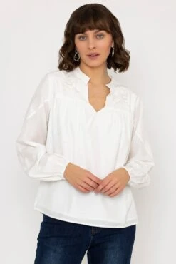 Embroidered blouse in ecru by Rowen Avenue. This staple piece features intricate embroidery that adds a touch of elegance to any outfit. Perfect for both casual and formal occasions, this blouse is a must-have for any fashion-forward individual.