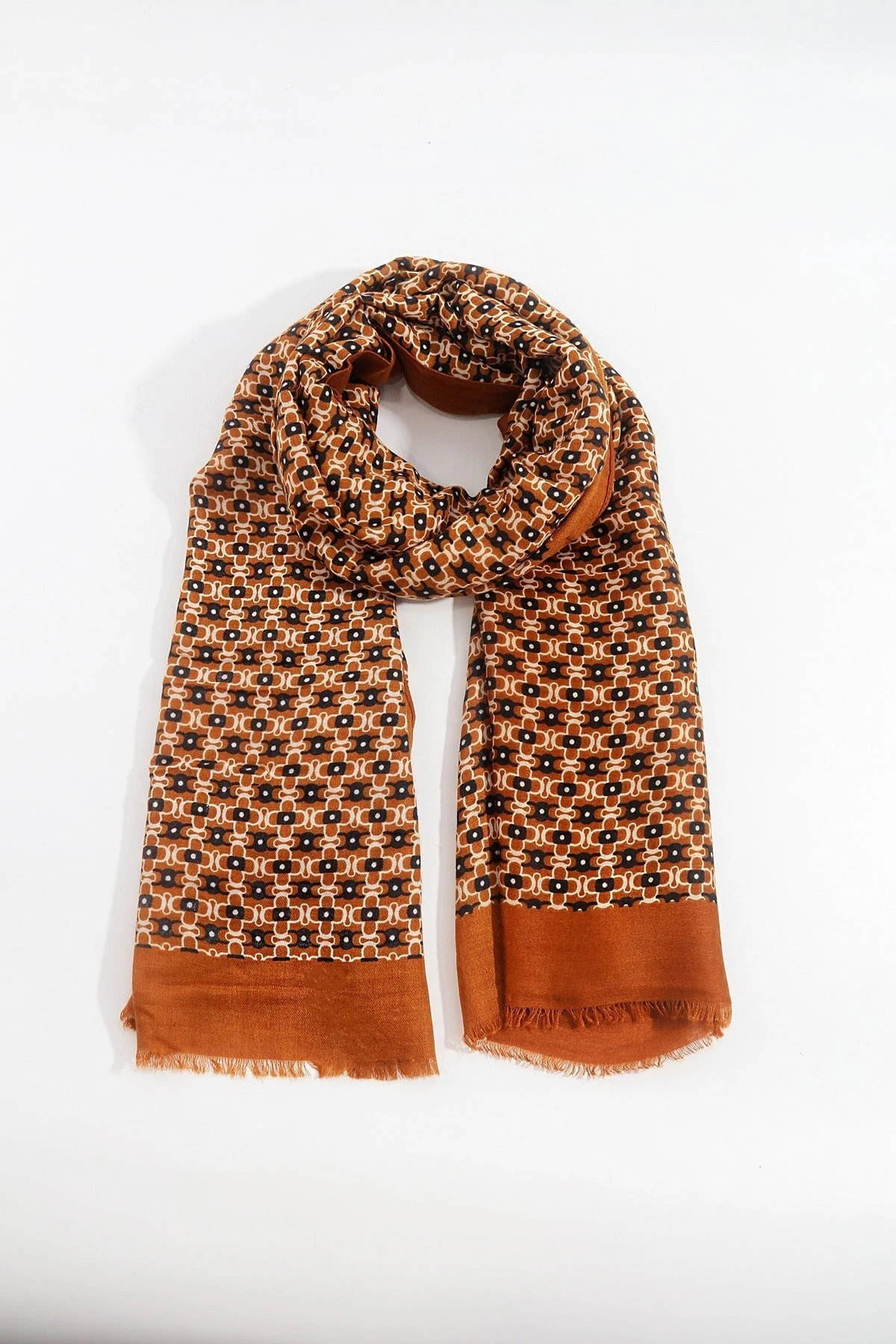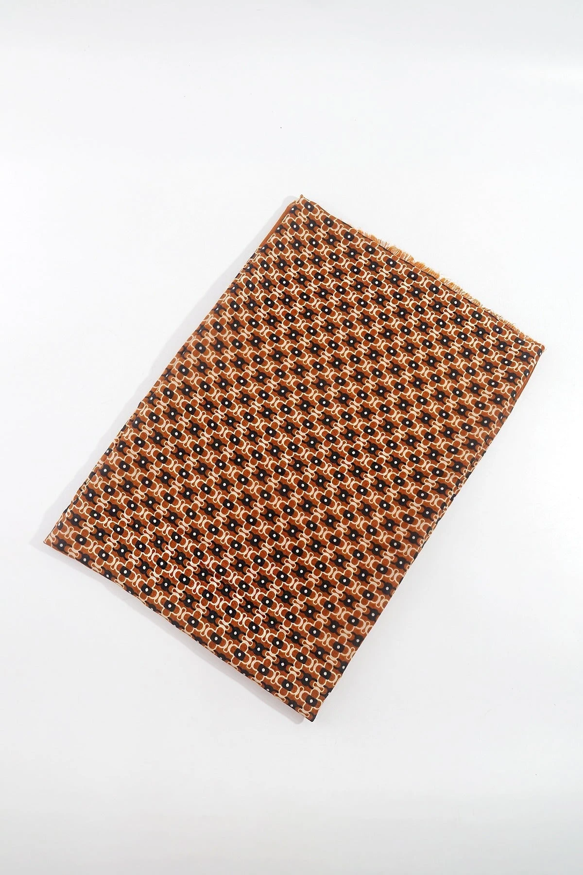 Geometric Print Scarf in Brown by Soul Accessories. This eye-catching scarf features a bold geometric pattern that adds a touch of sophistication to any outfit.Â