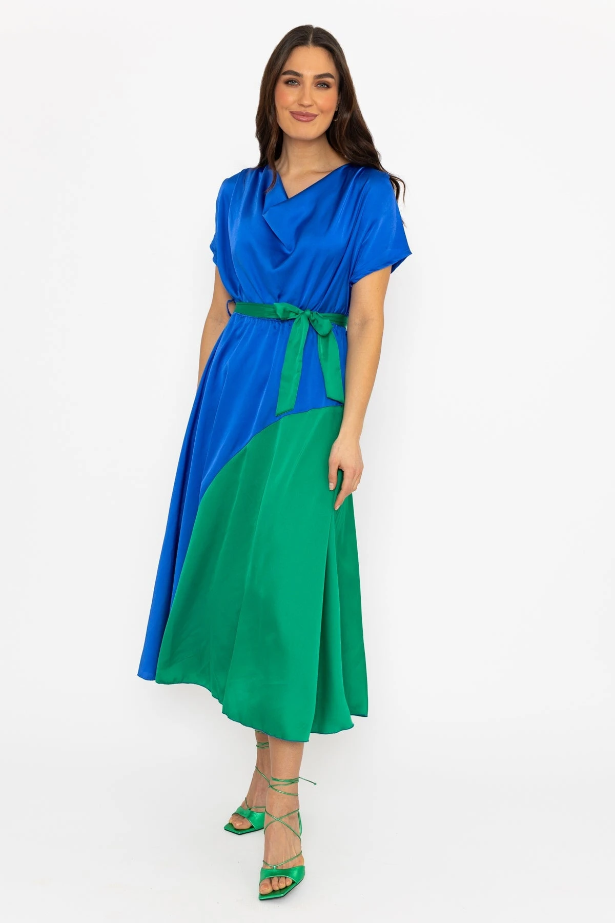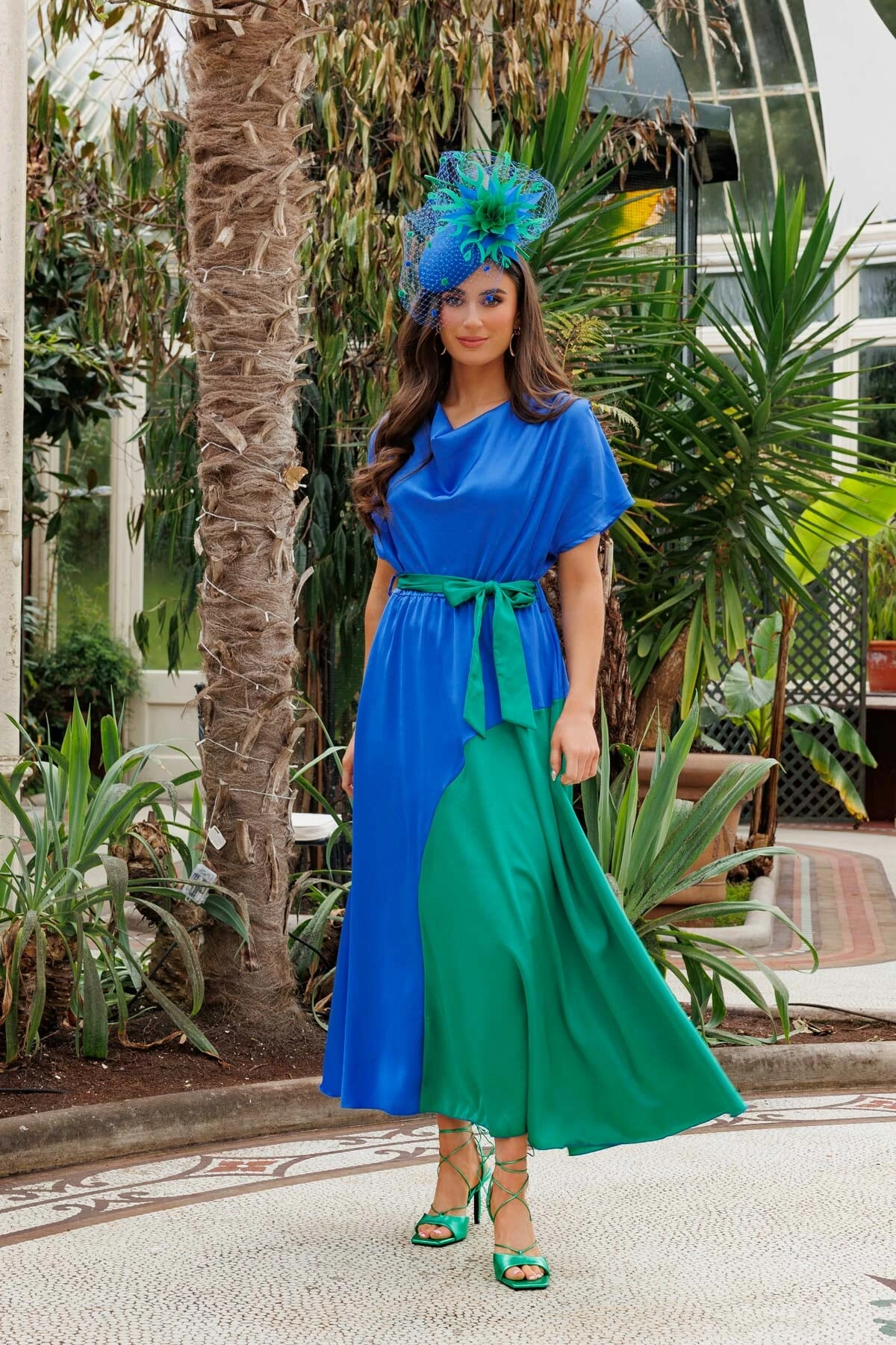 Gigi Midi Dress in Blue by Pala D’oro. With an elegant a-line cut, this blue and green ladies midi dress is perfect for weddings or a day at the races.