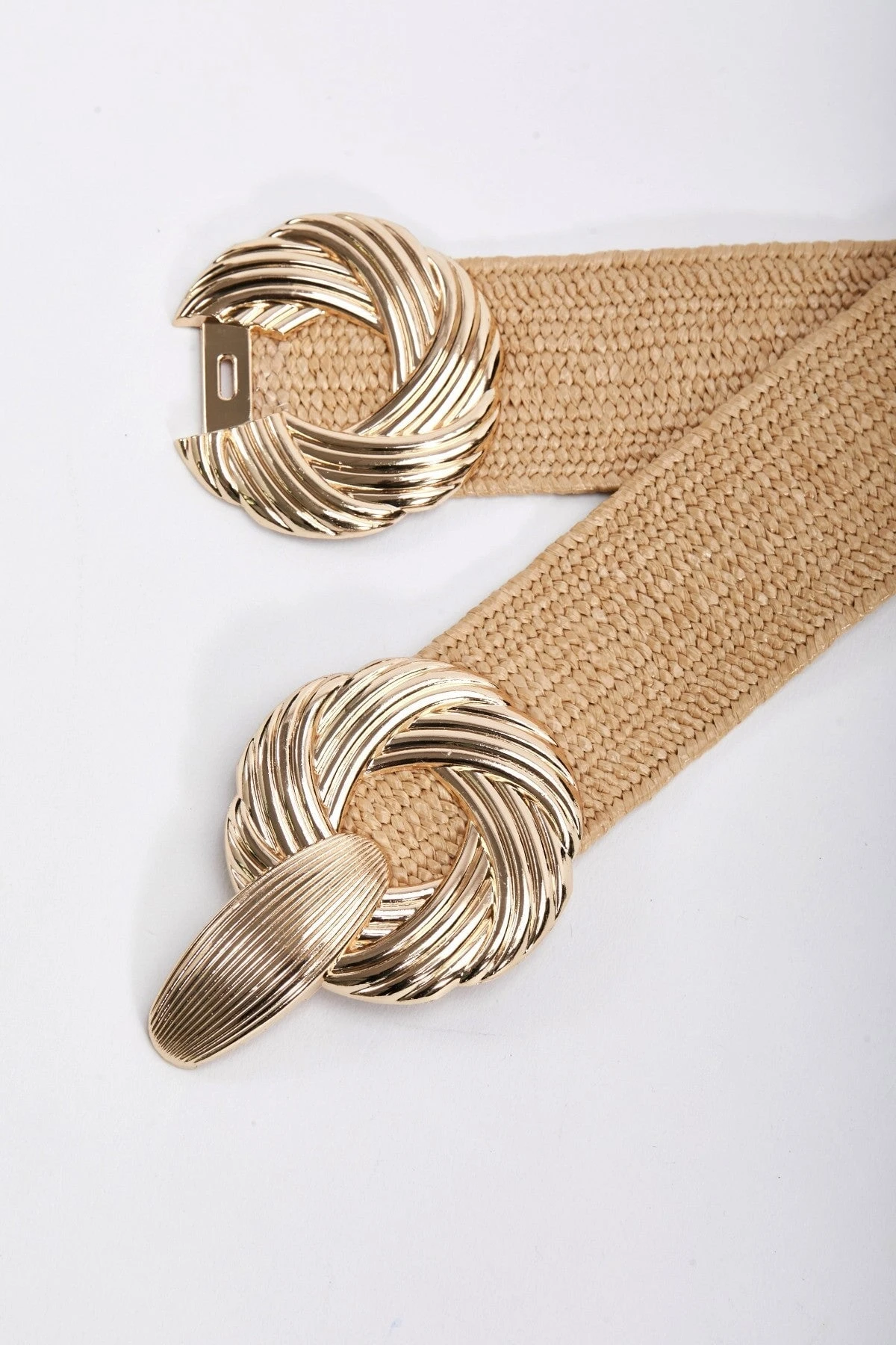 Gold Clap Woven Elastic Belt by Soul Accessories. This ladies belt effortlessly pairs with any summer outfit, adding a touch of elegance and style.Â