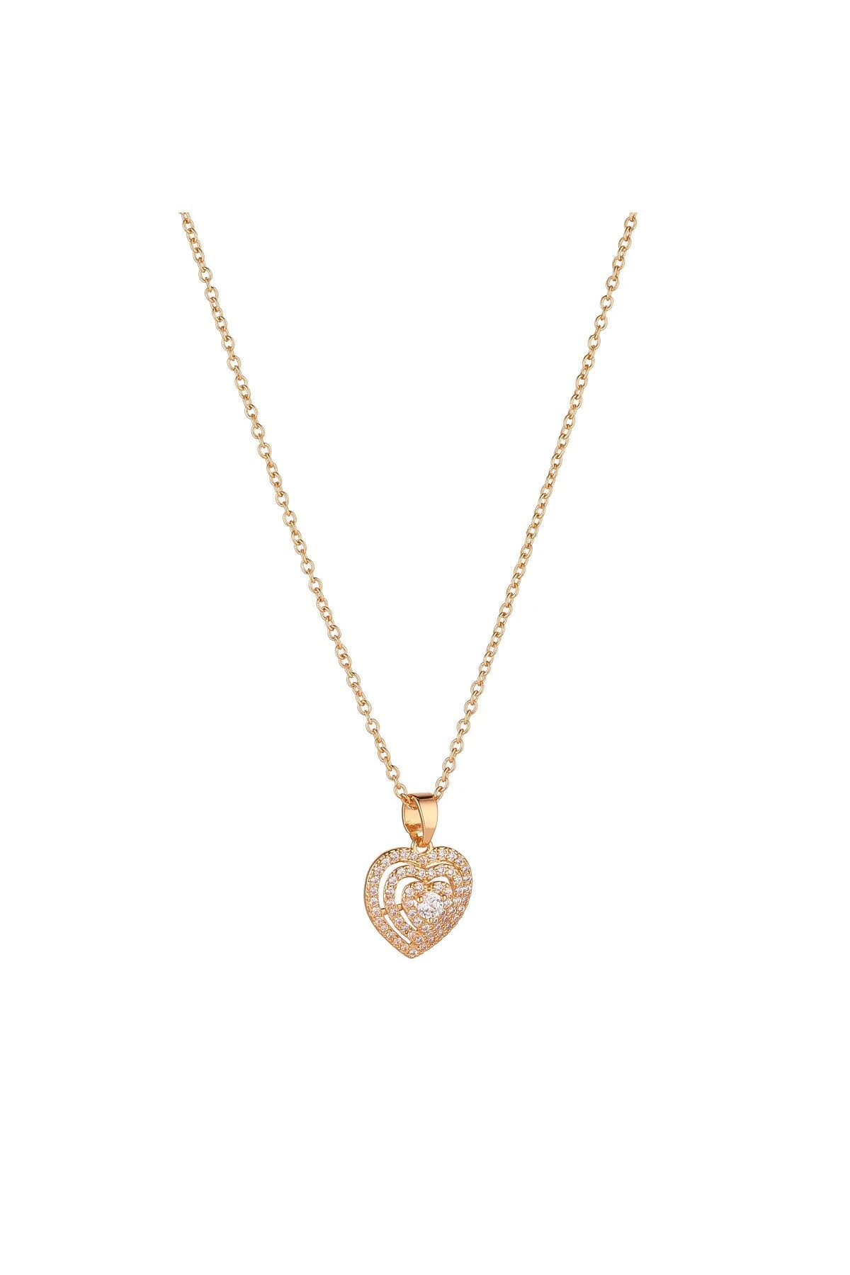 Beautiful pendant with tiered heart shapes and centre CZ stone. Gold plating. Length 16″ + 2″ extension.