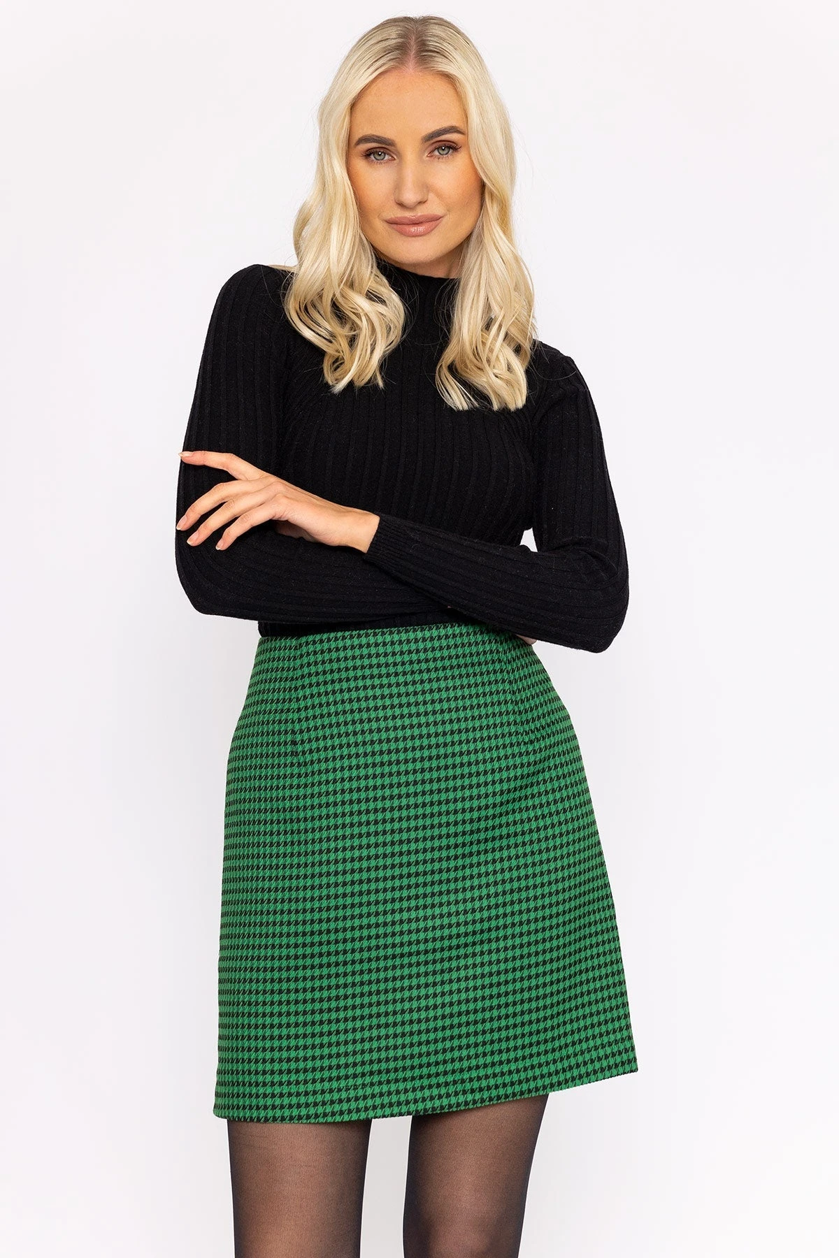 Houndstooth mini skirt in green by Rowen Avenue. Comfortable and stylish.