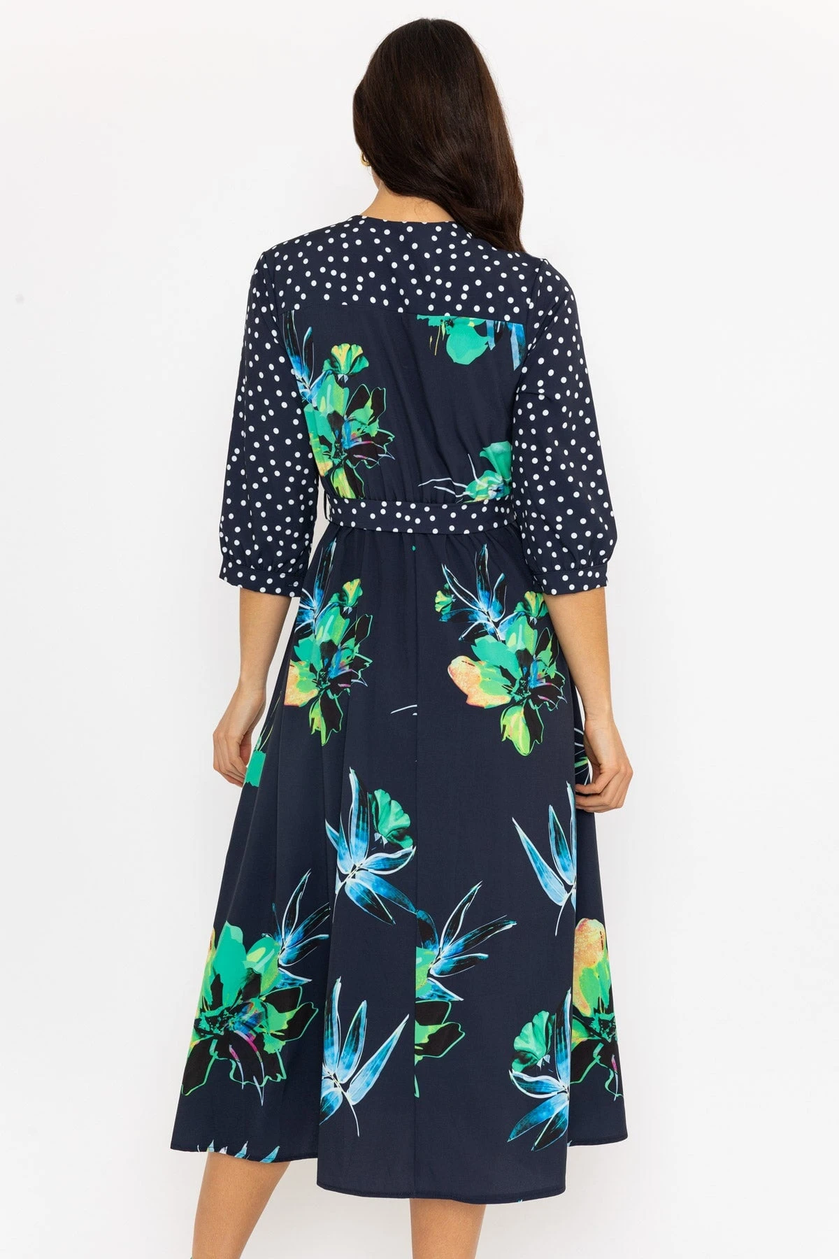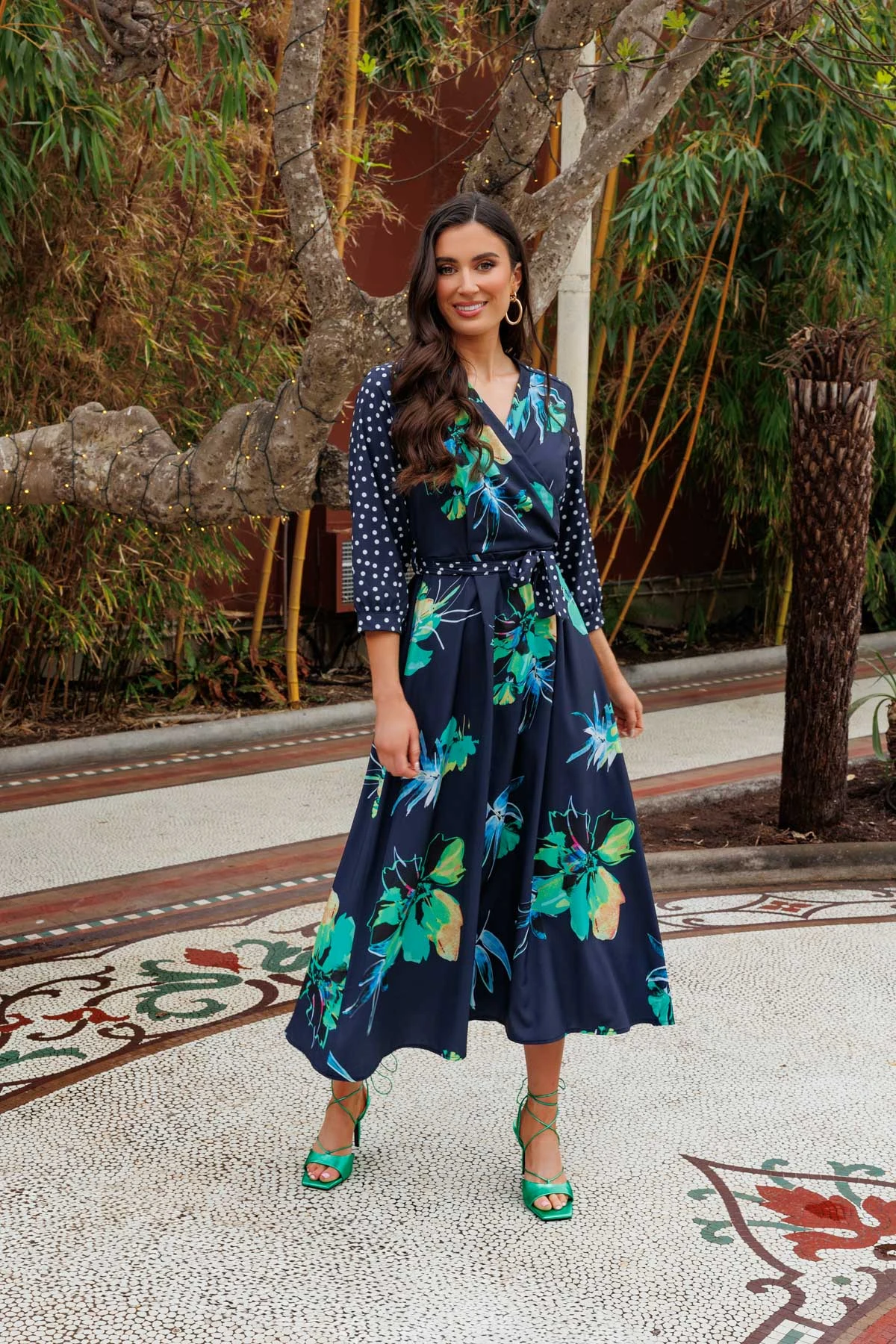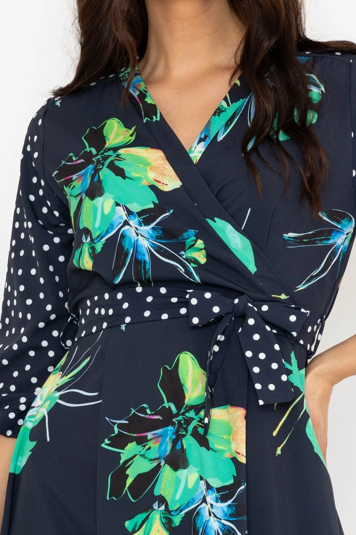 Beautiful midi dress in navy print by Pala D’oro. Featuring a beautiful floral and polka dot print. Its midi length provides both style and comfort, making it perfect for any event. Elevate your wardrobe with this must-have dress.