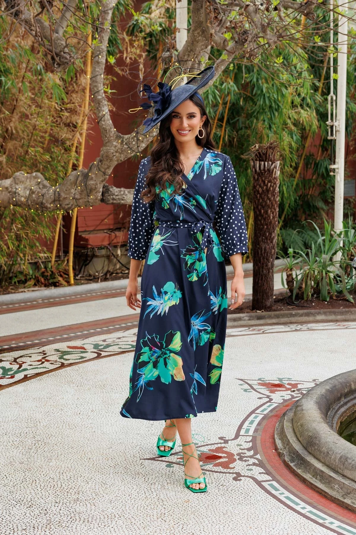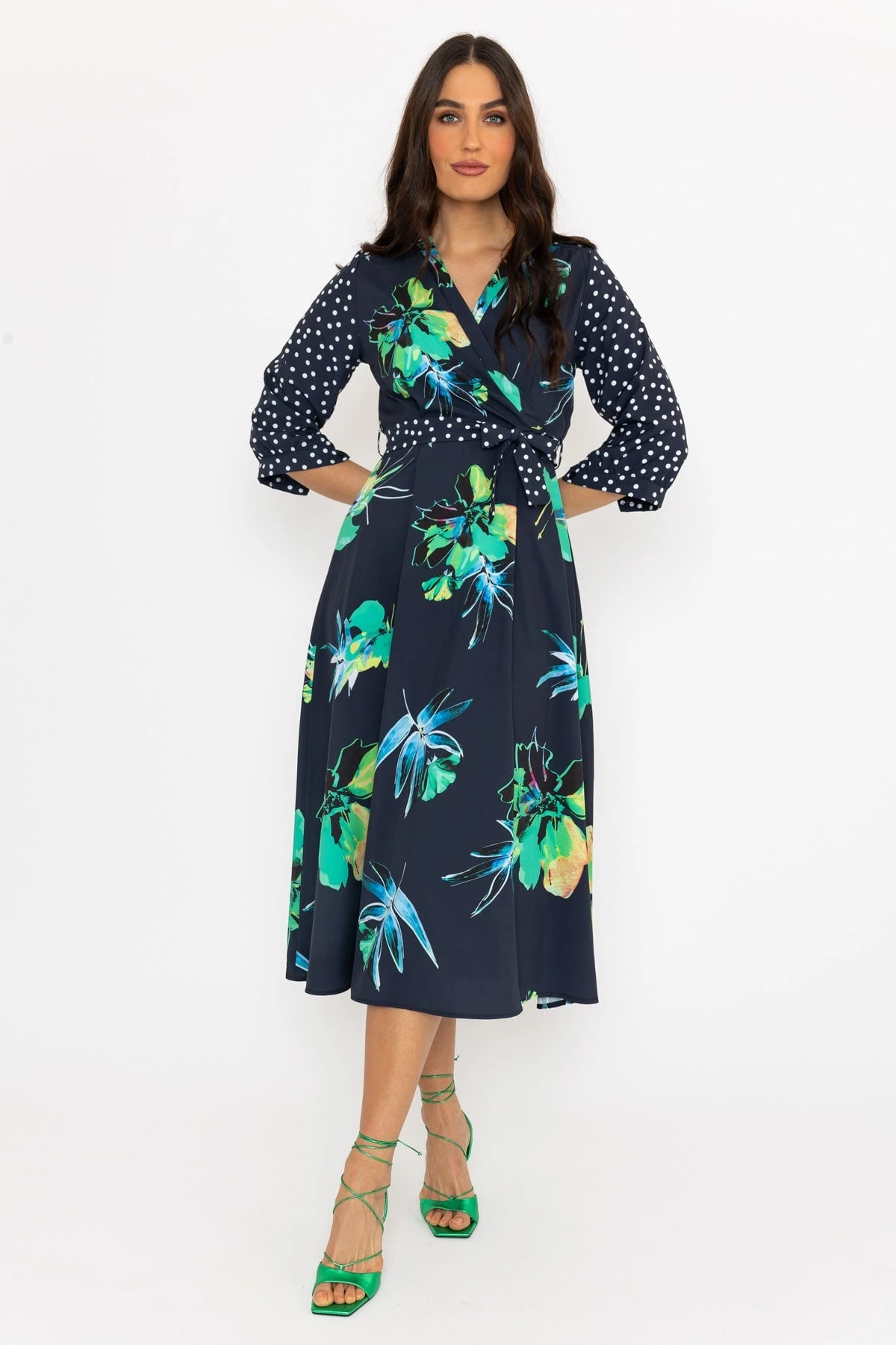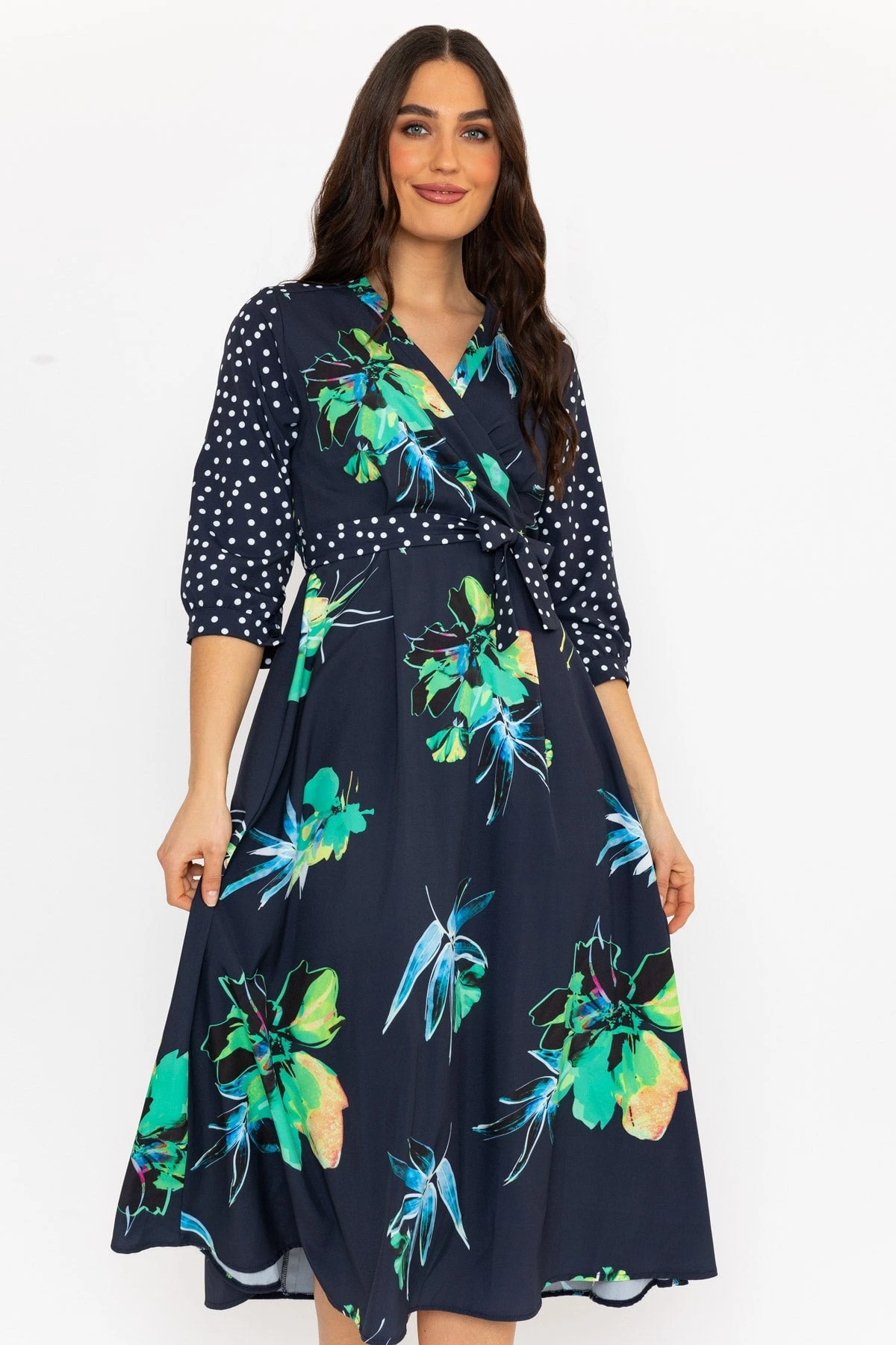 Beautiful midi dress in navy print by Pala D’oro. Featuring a beautiful floral and polka dot print. Its midi length provides both style and comfort, making it perfect for any event. Elevate your wardrobe with this must-have dress.