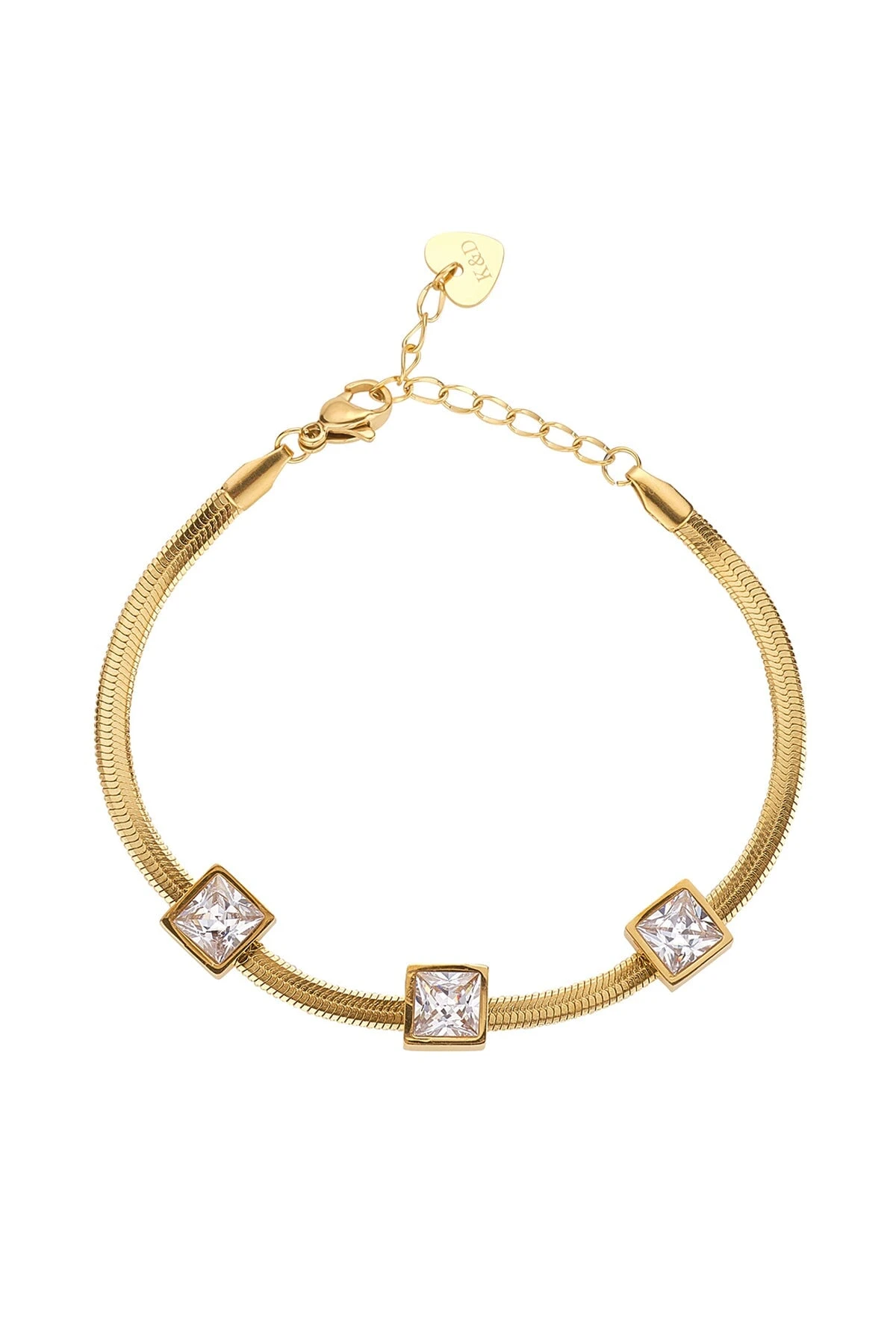 Elegant flat snake chain embellished with 3 CZ stones. Gold plating.