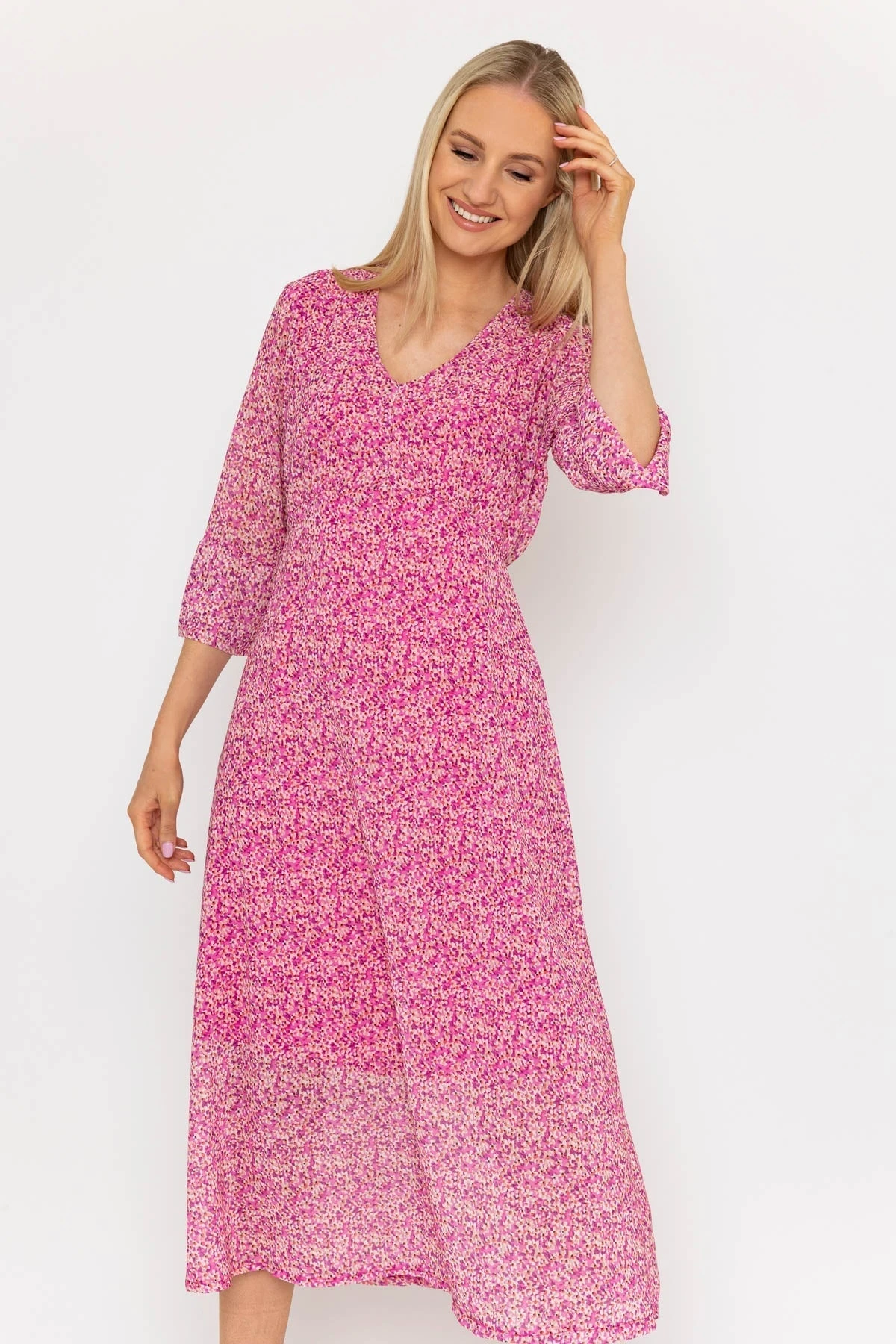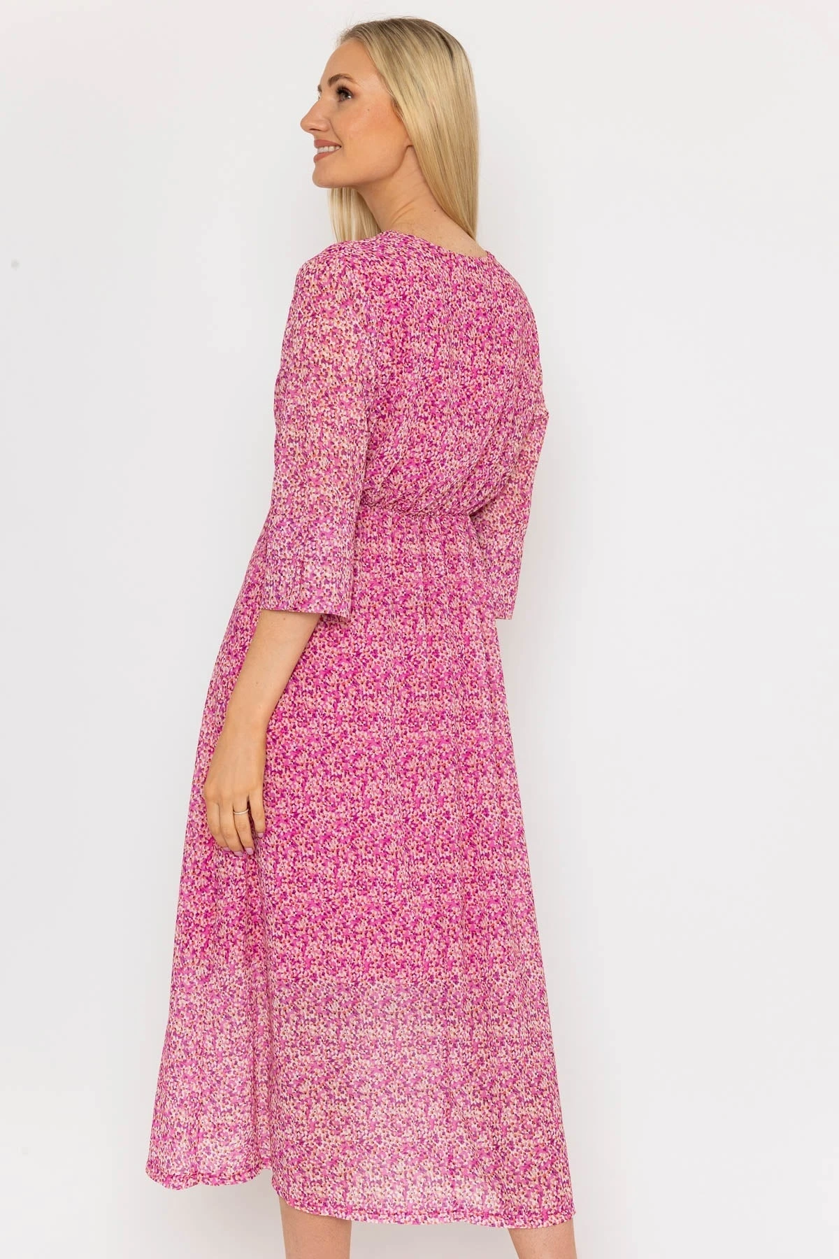 Best selling midi dress in pink print by Pala D’oro. Perfect for any occasion. Add this timeless dress to your wardrobe for a stylish, long-lasting look.