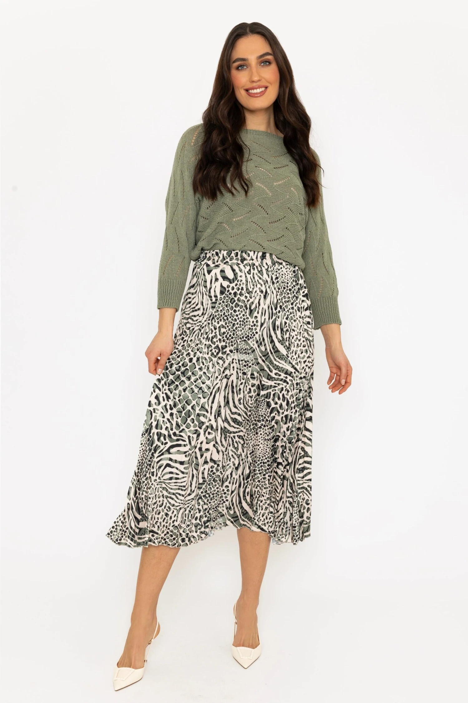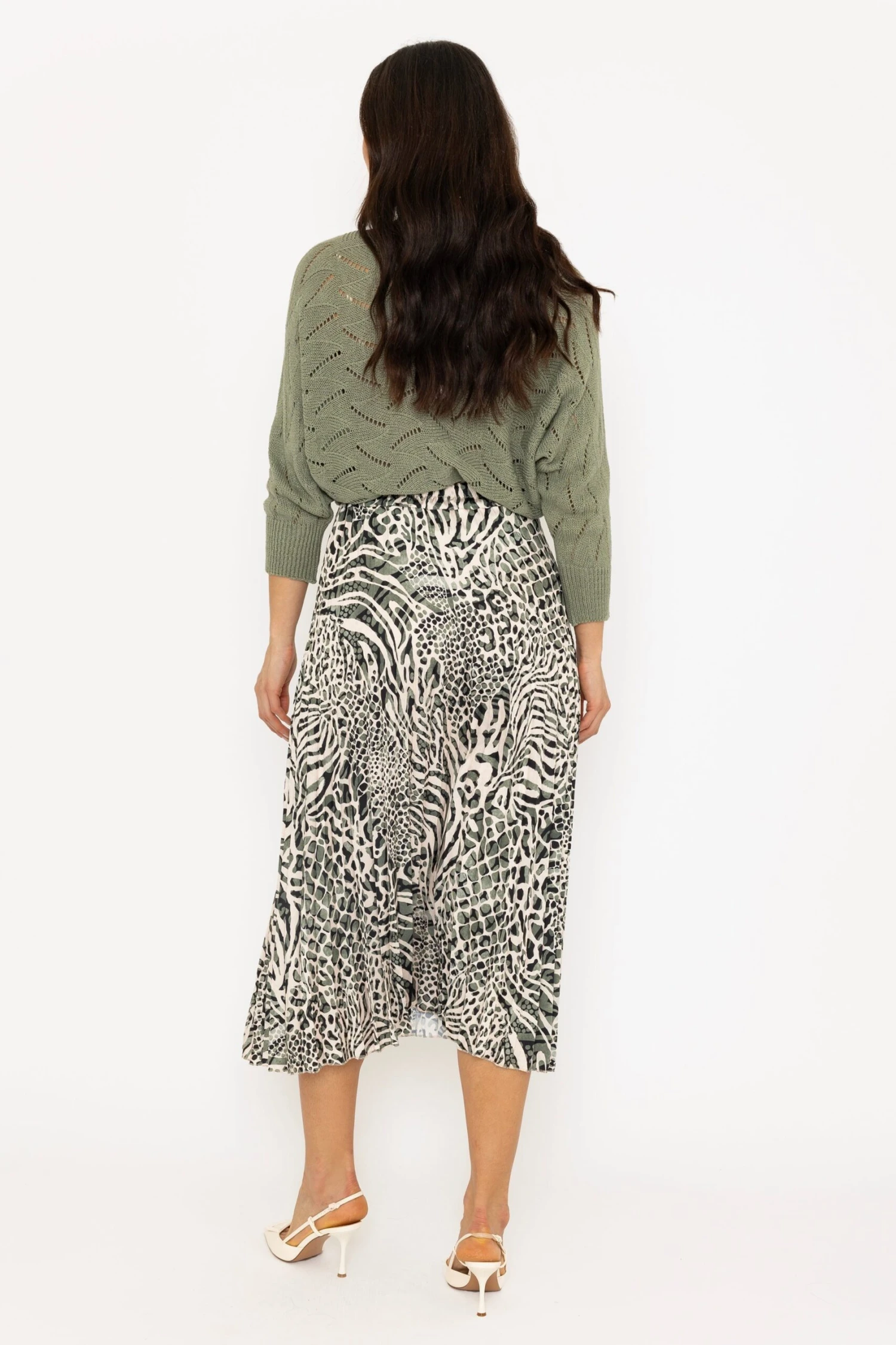 This unique skirt features a bold animal print that will make a statement wherever you go. The pleated design adds texture and movement to your outfit, while the khaki color adds a touch of sophistication.