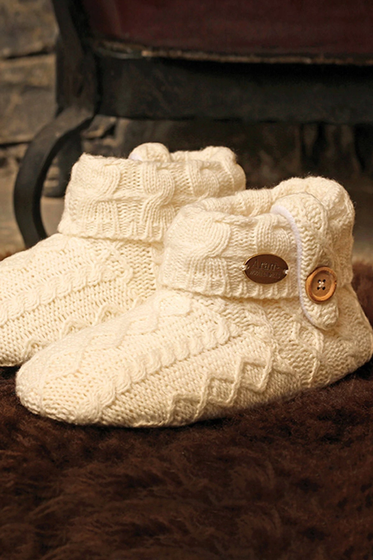 Kids Cream Aran Woollen Mills slippers with traditional cable knit pattern and fleece lining.