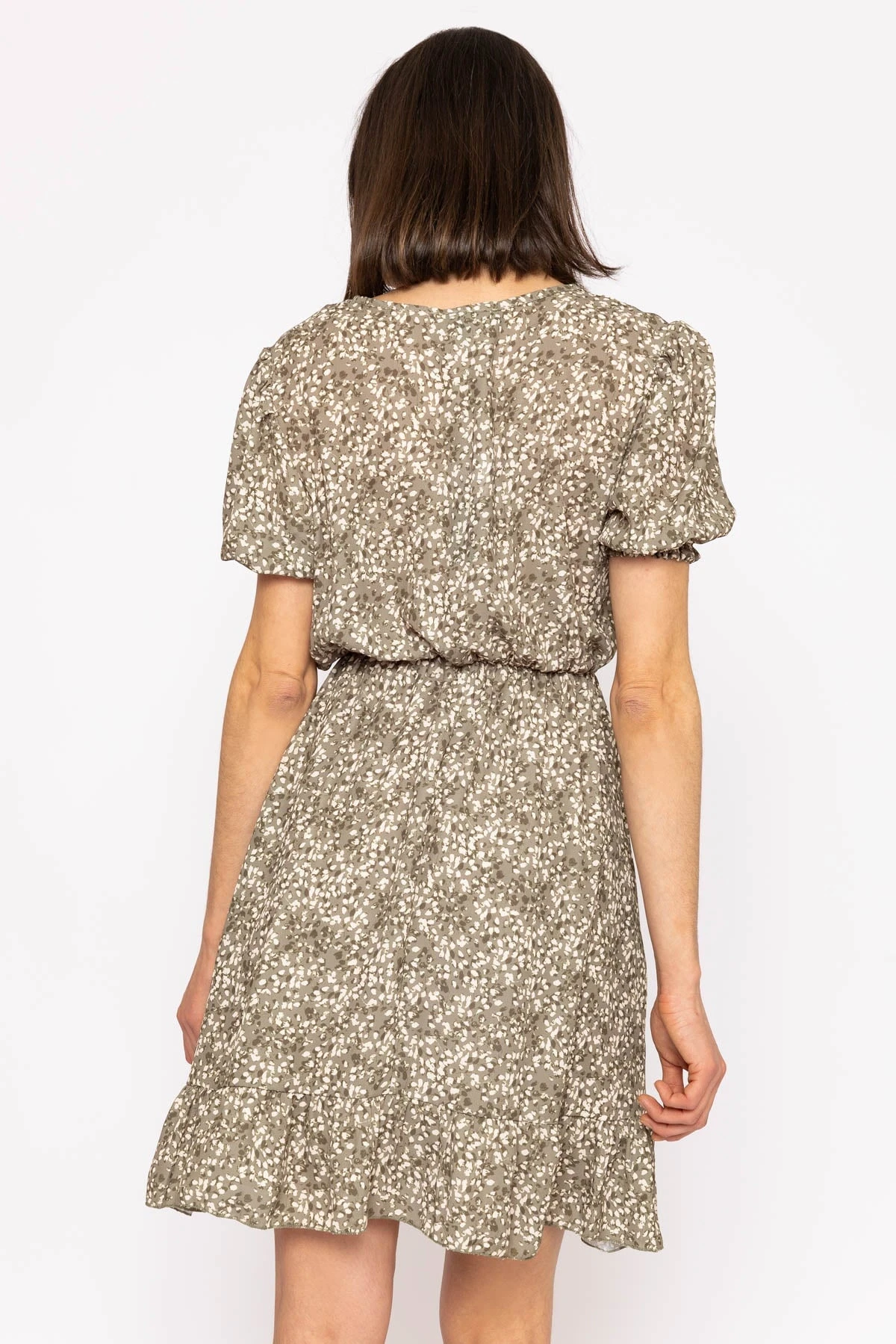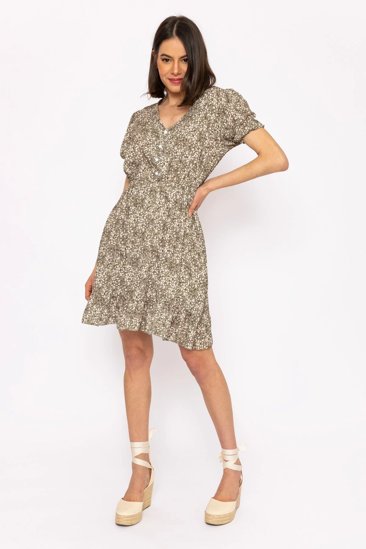 Khaki printed mini dress by Palo D’oro. A cute summer occasion dress that can be dressed up for night-time and dressed down with trainers for day wear.Â