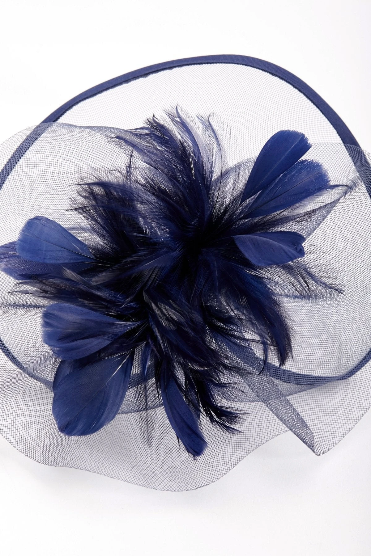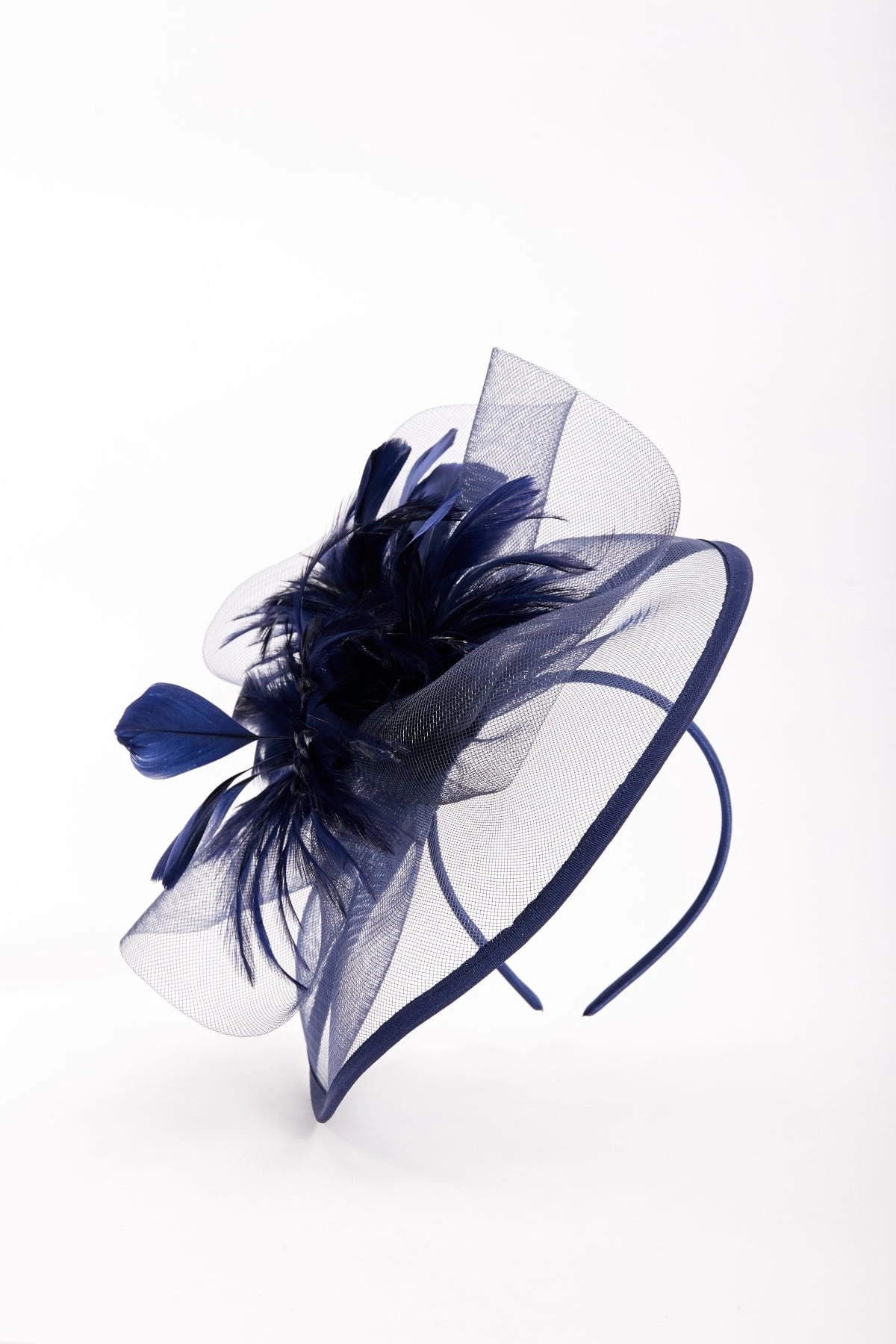 This large navy fascinator with feather adds a touch of elegance to any special occasion.