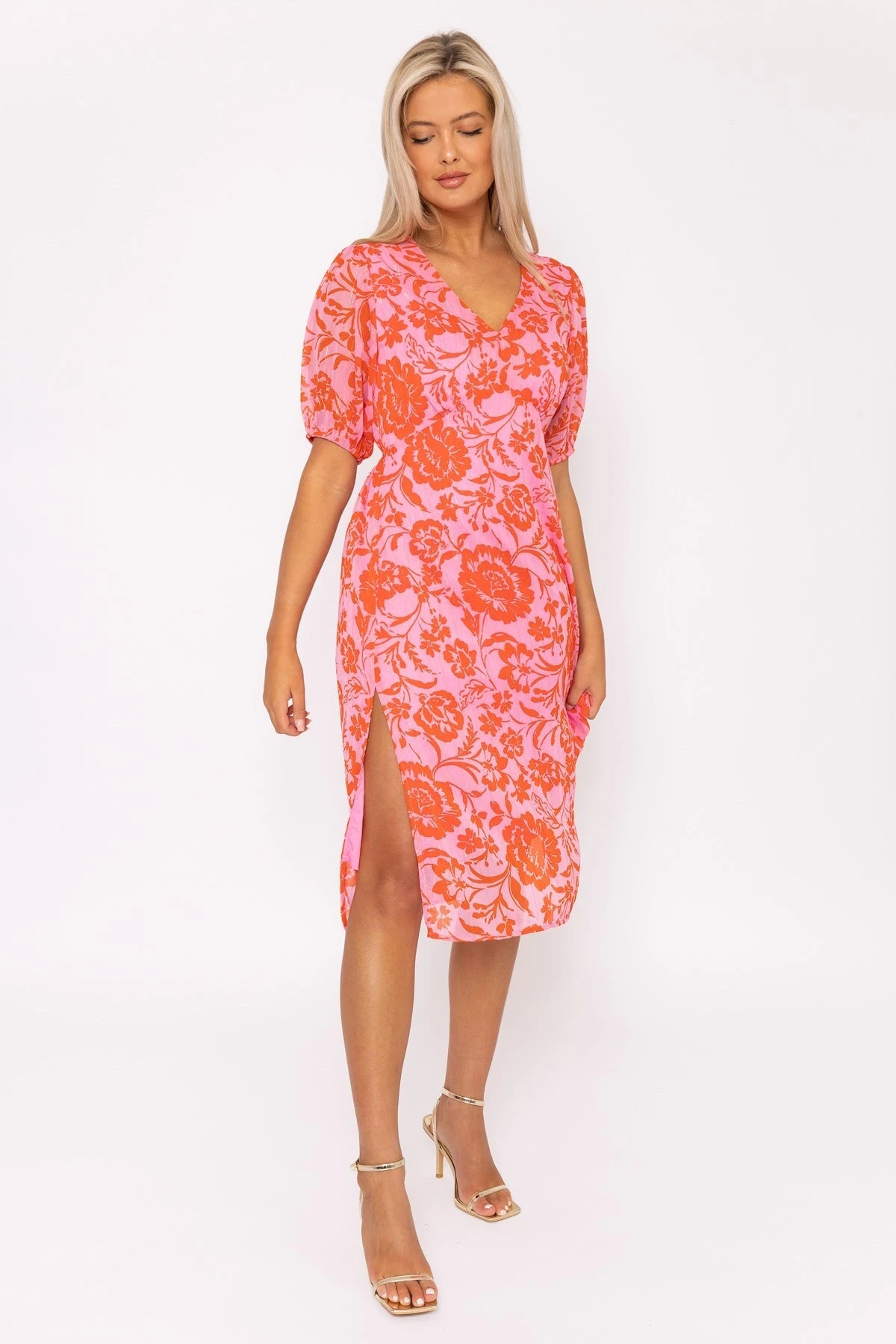 Pink print midi dress by Rowen Avenue. This short sleeve floral print dress will take you from summer days to summer nights and is a holiday wardrobe essential.