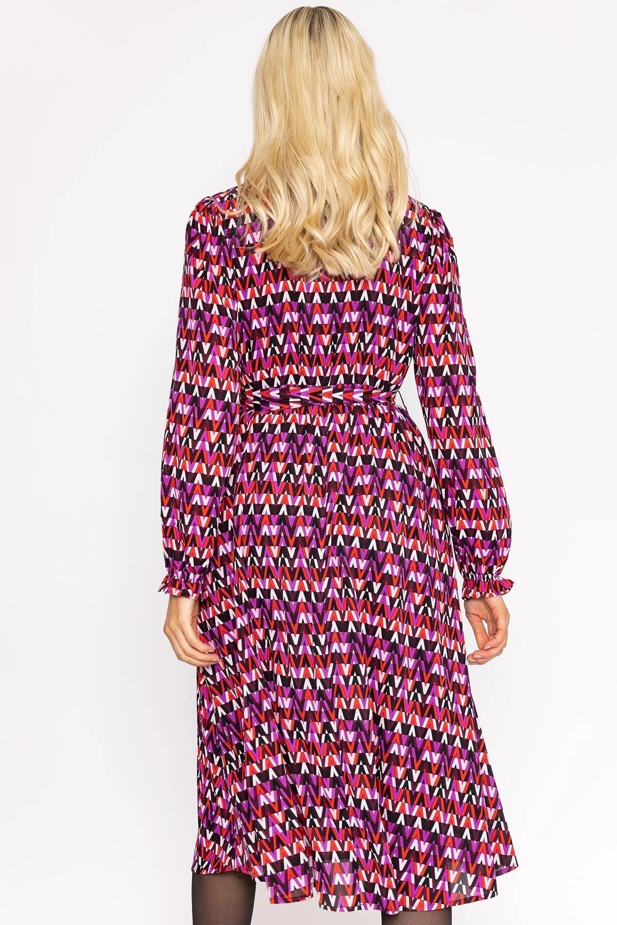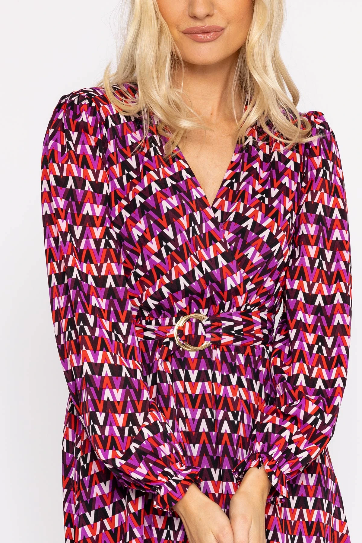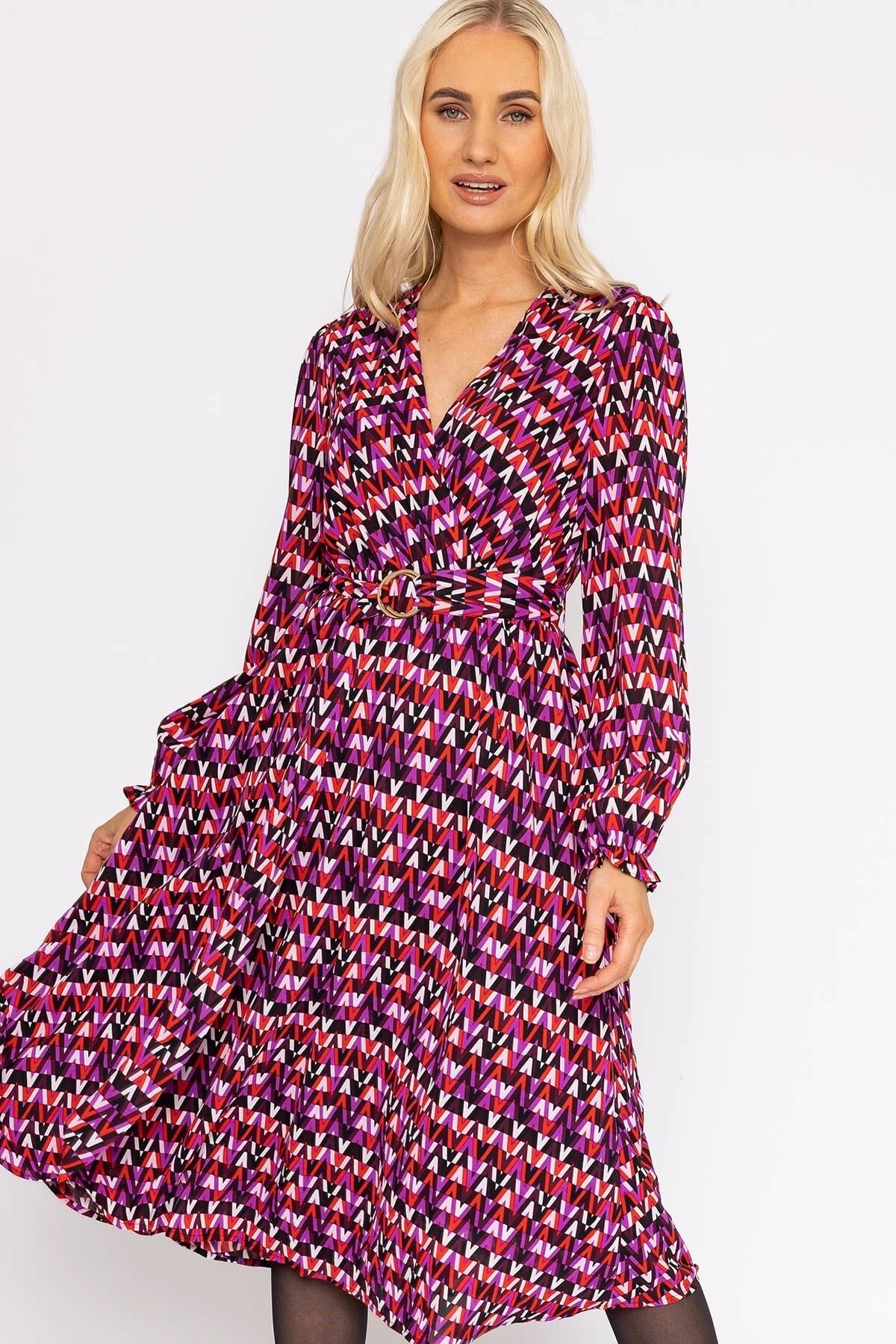 Long sleeved midi dress in pink geo print by Rowen Avenue.
