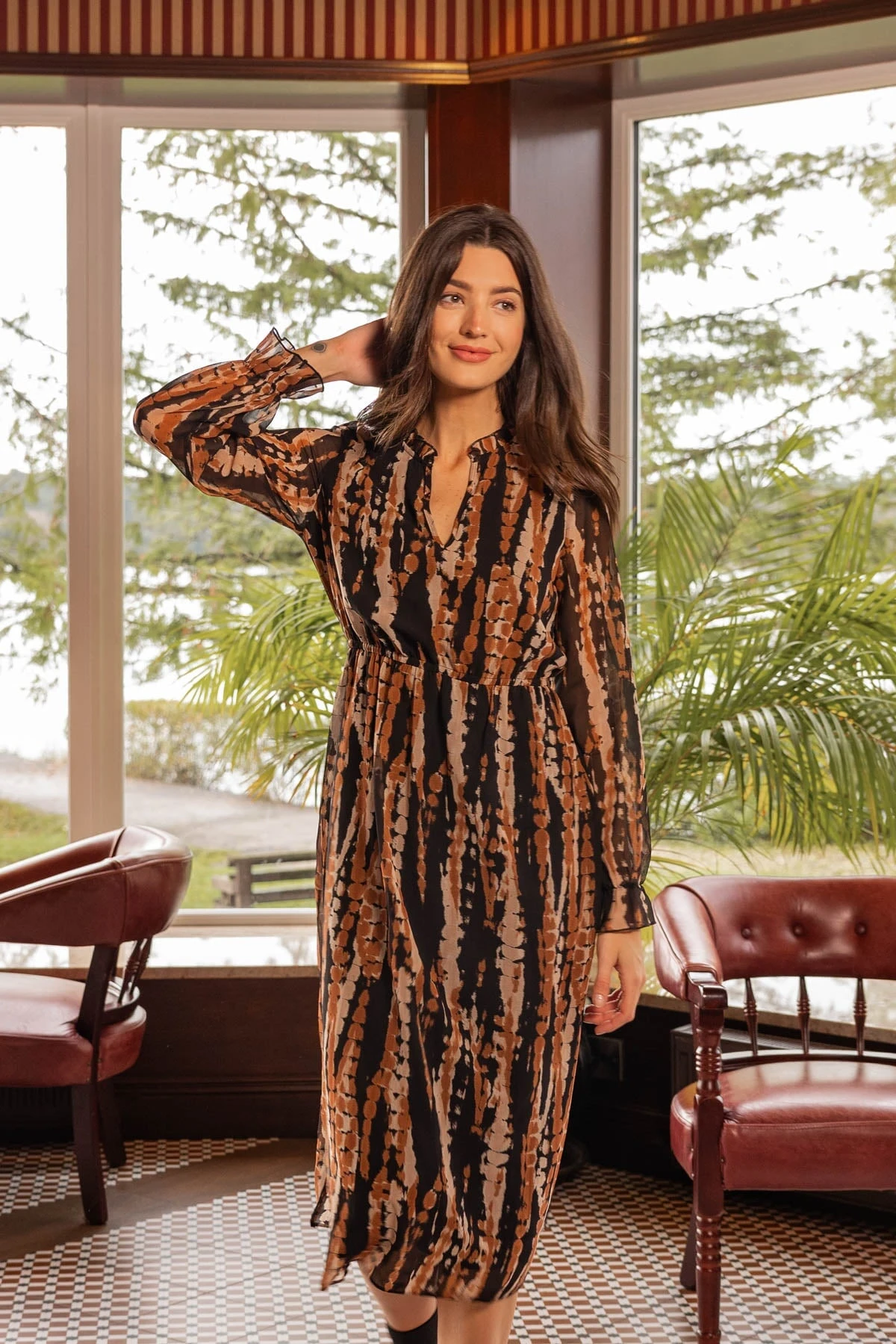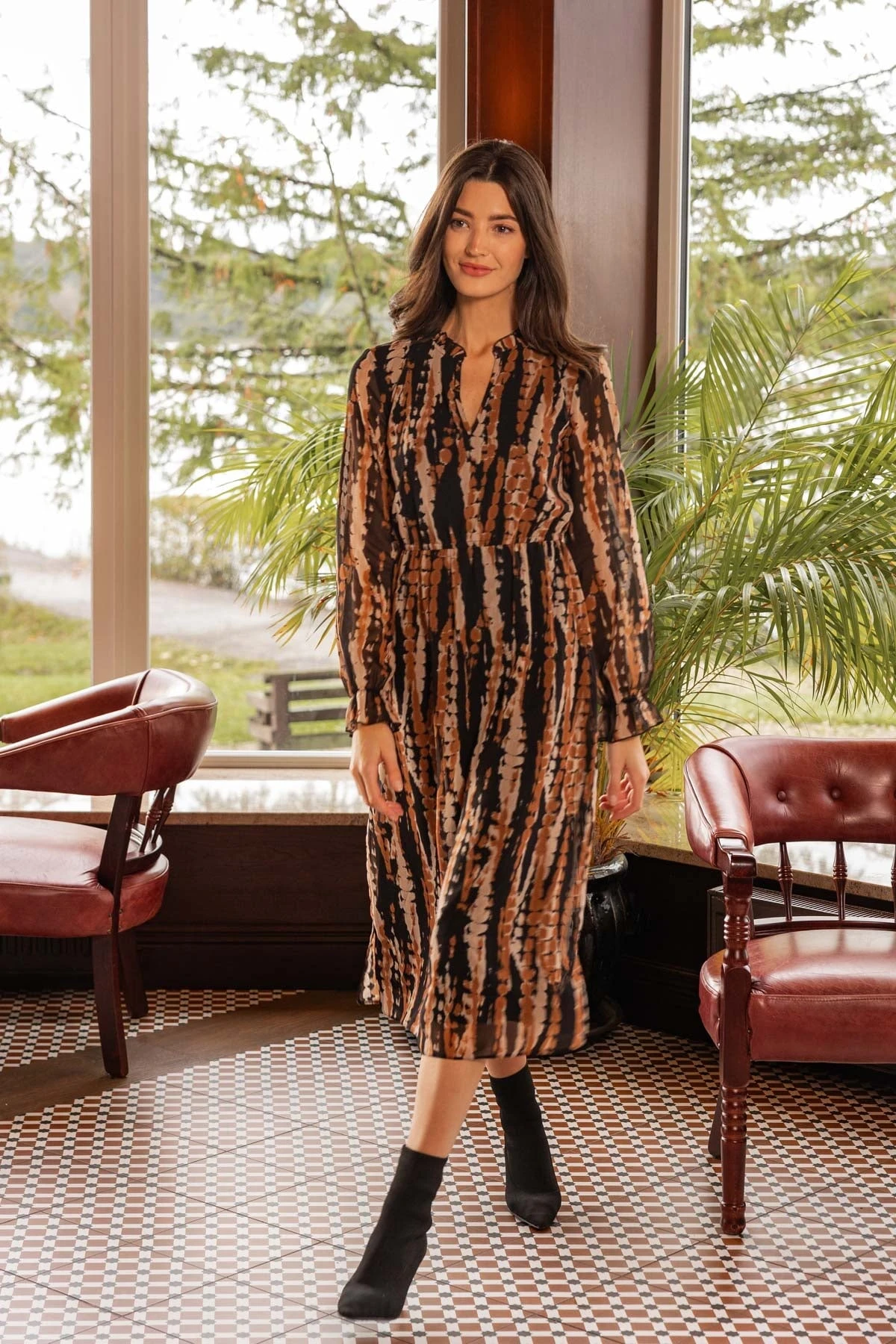 Long sleeve midi dress in animal print by Rowen Avenue. Look stylish and stay comfortable in this midi dress. Perfect for any occasion!