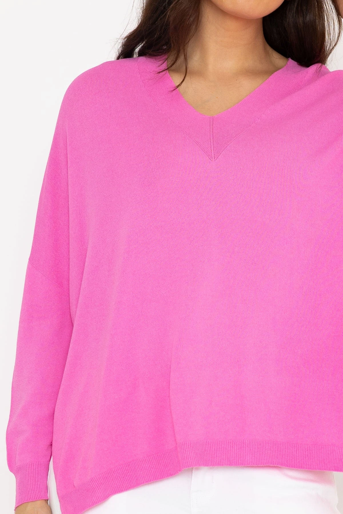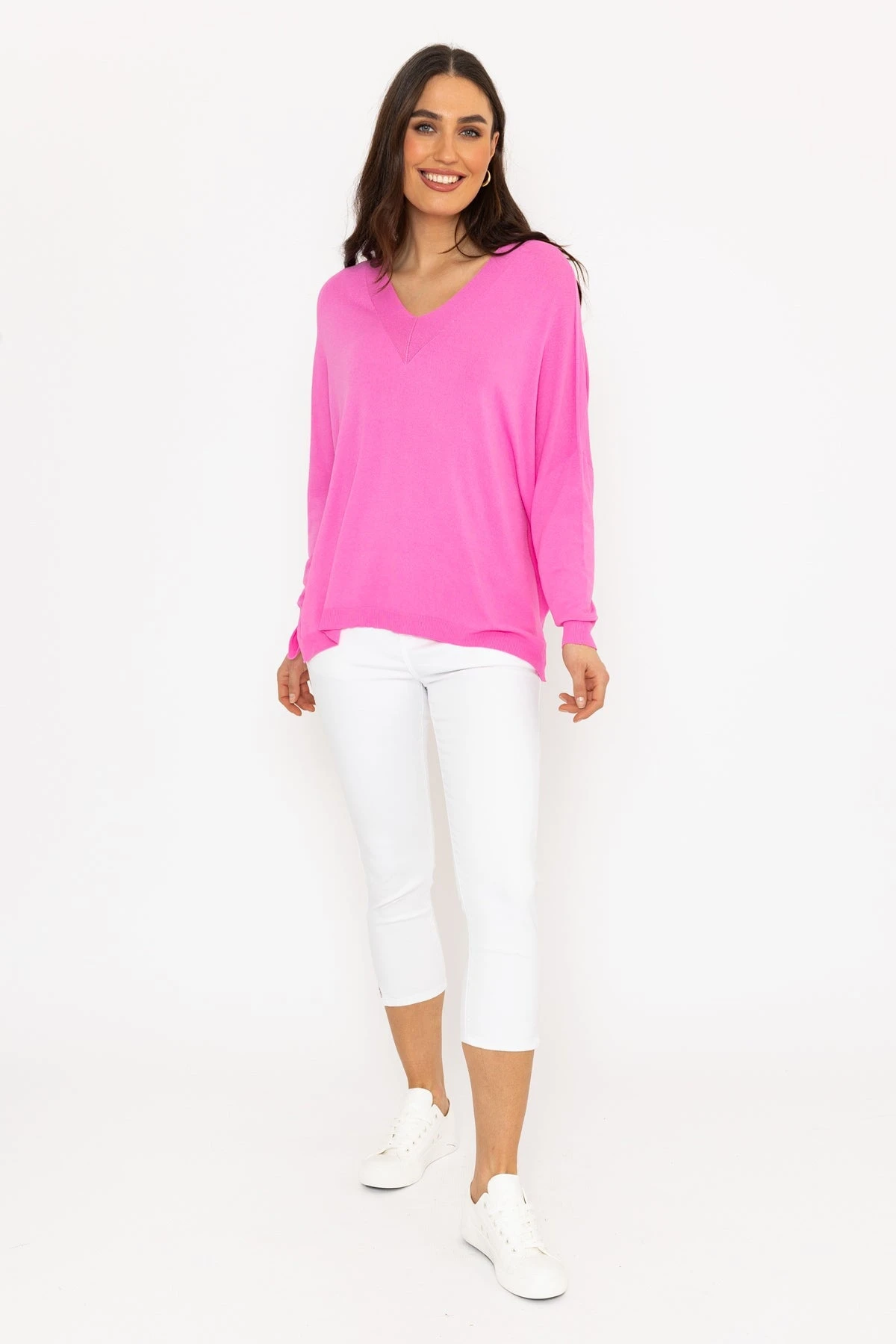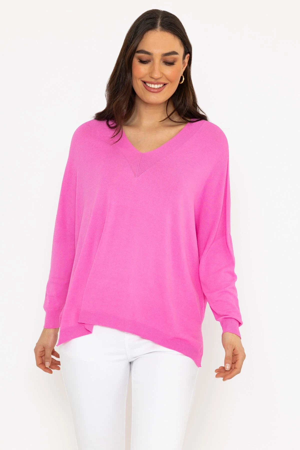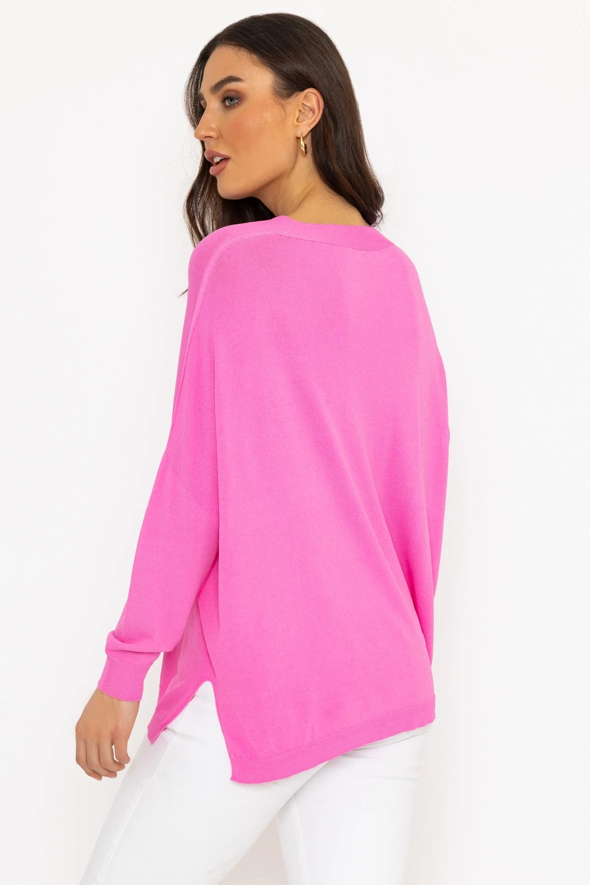 Oversized V-Neck Jumper in Pink by Pala D’oro. Made with comfort in mind, this lightweight jumper features a flattering dipped hem. Embrace the perfect blend of fashion and functionality with this must-have addition to your Summer wardrobe.Â