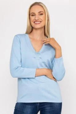 Plain knit sweater with diamonte detail in blue by Voulez Vous. Its luxurious feel and subtle diamonte detailing add a touch of elegance to any outfit. Stay cozy and stylish with this versatile piece.