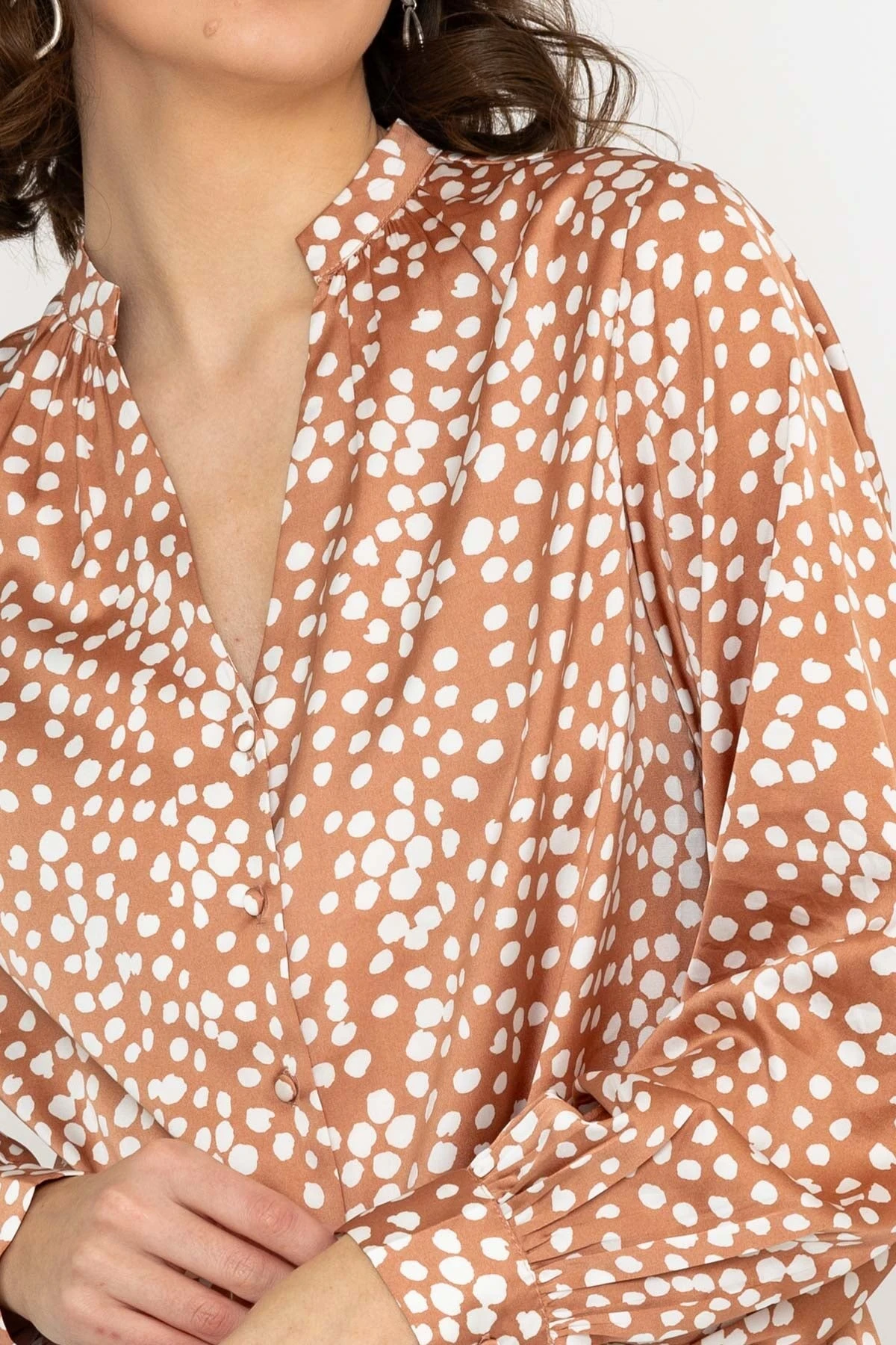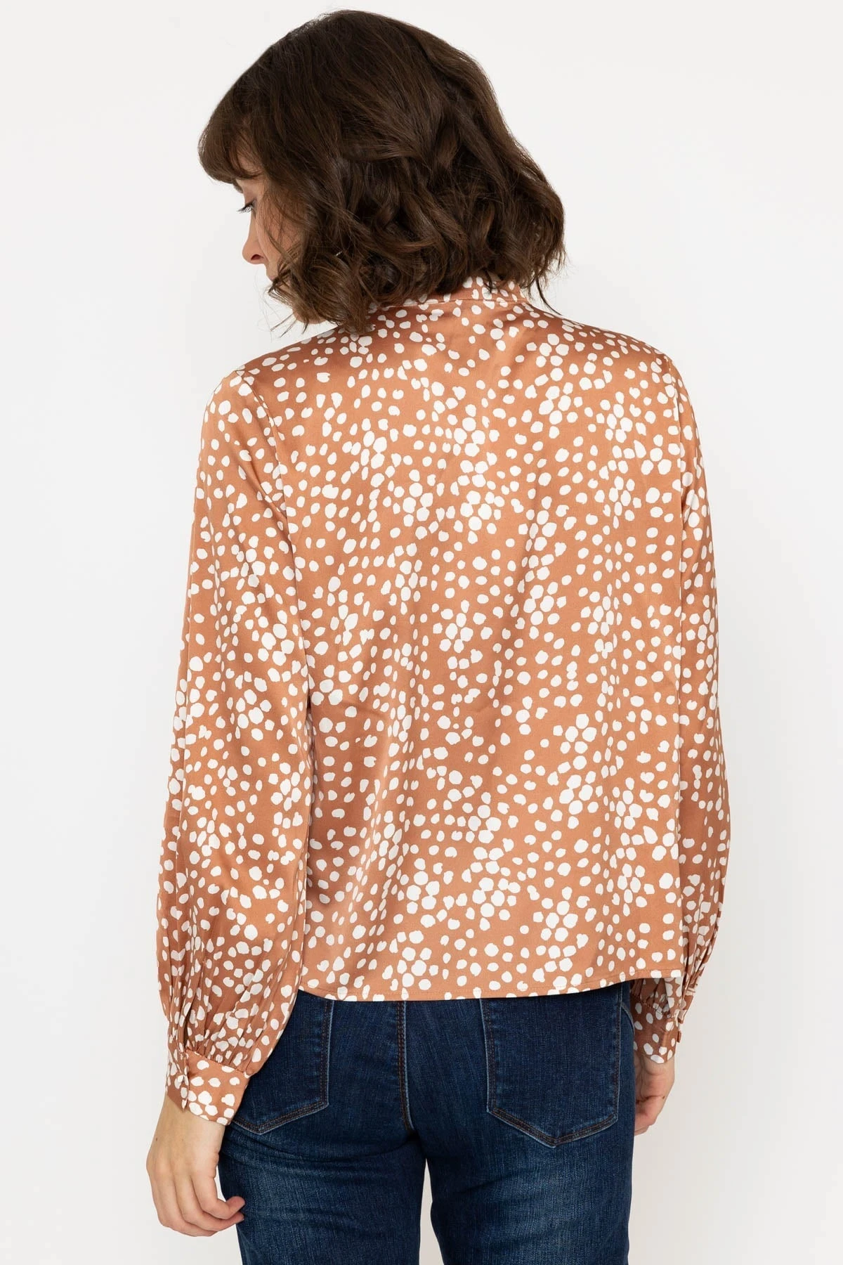 Polka dot print blouse in brown by Rowen Avenue. Perfect for a day at the office or a night out, this blouse is versatile and stylish.