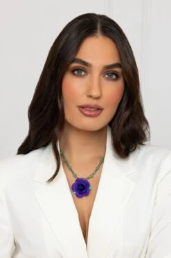 Purple Flower Necklace by Soul Jewellery. Featuring a trendy floral design, this ladies necklace is the perfect accessory to add a pop of color and elevate your style.