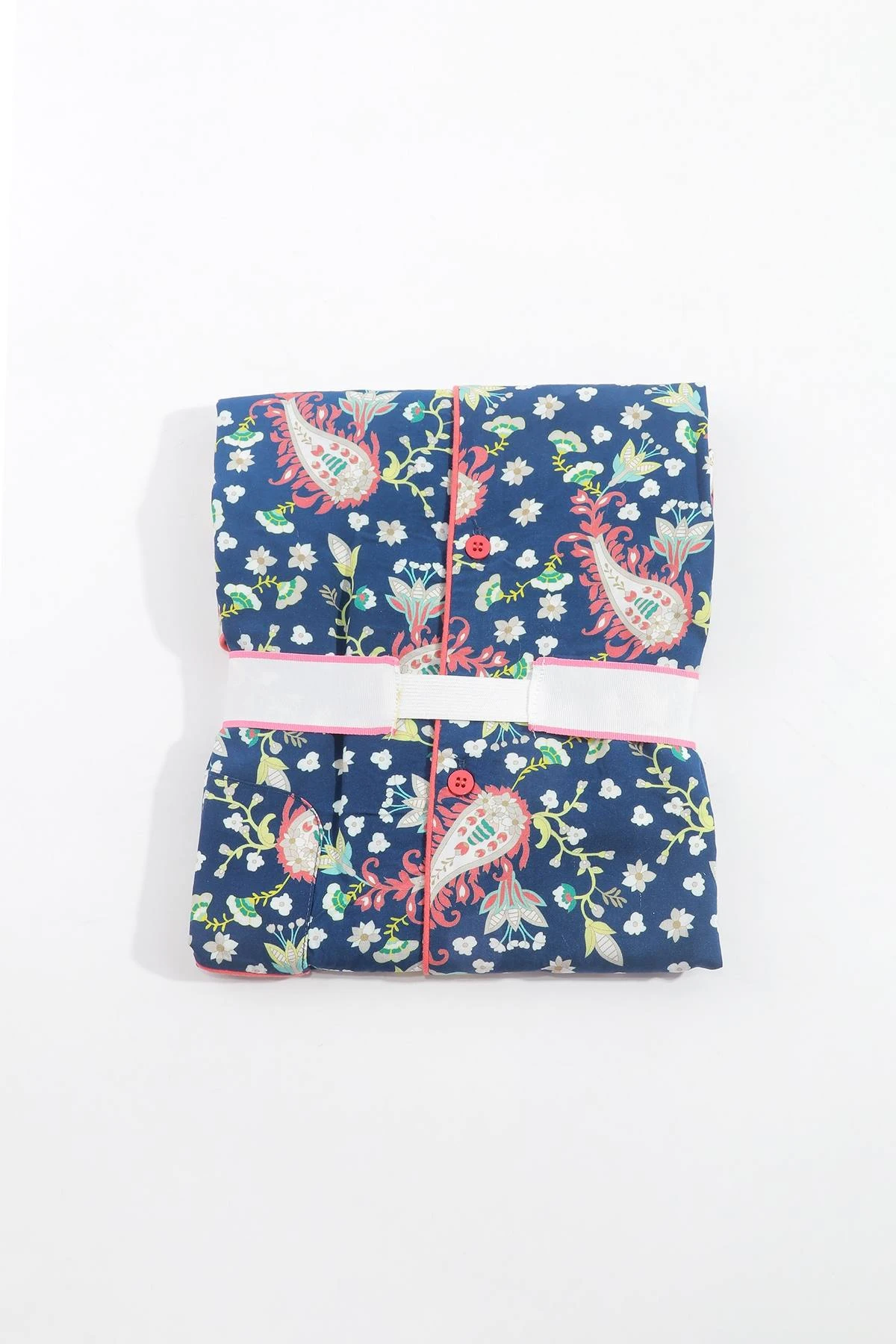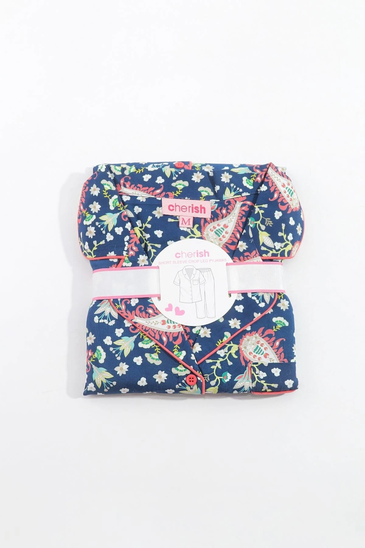 Button down pyjama set with 3/4 leg in navy print by Cherish. Perfect for a good night’s sleep or lounging at home.