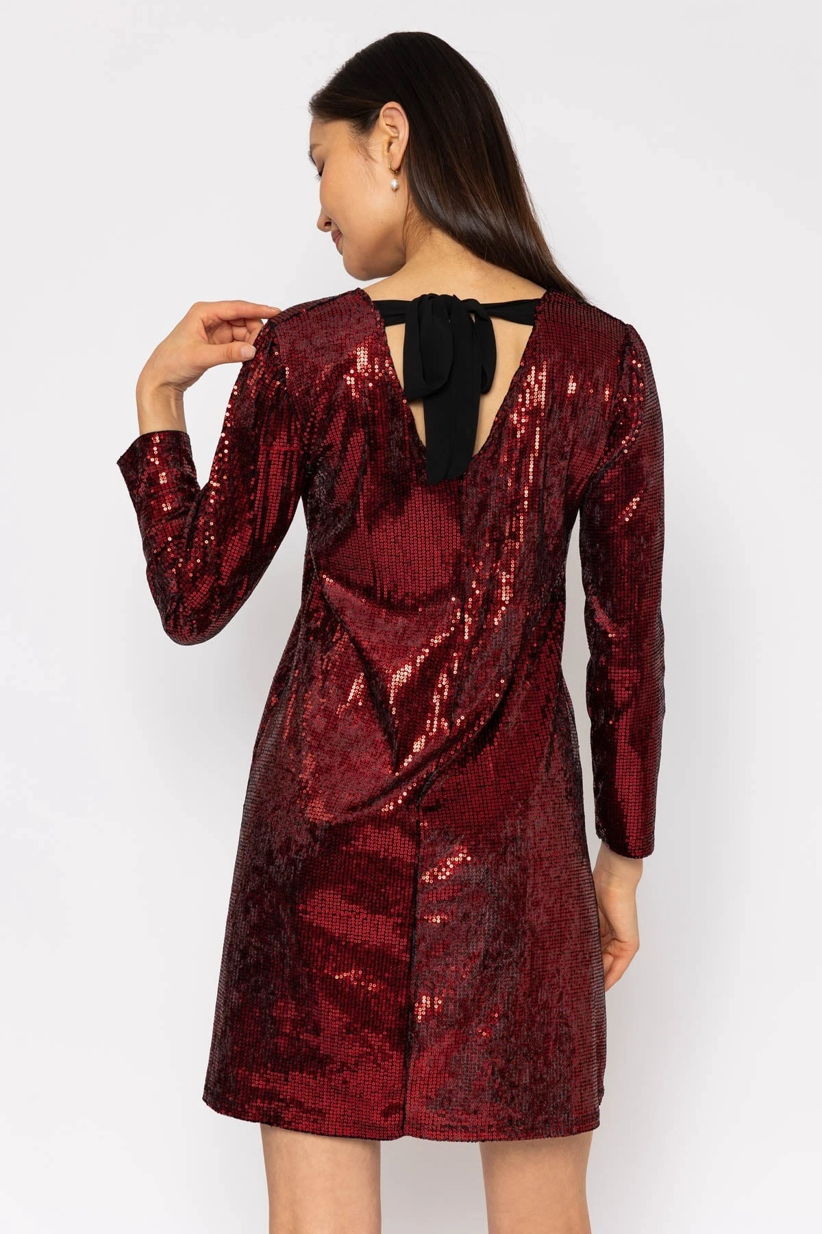 Sequin mini dress in red by Pala D’oro. Luxurious sequins give it a glamorous look and lightweight fabric ensures a comfortable fit. Create the perfect party ensemble with this eye-catching dress.