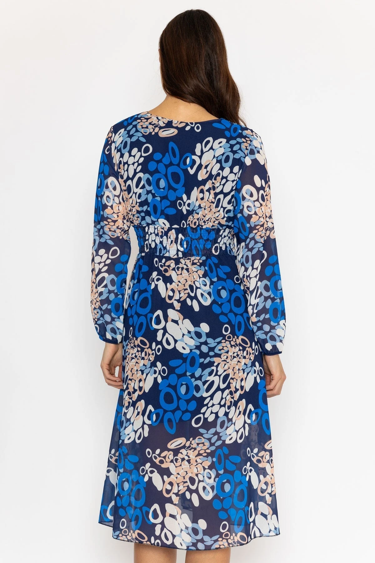 Long sleeve midi dress in blue print by Pala D’oro. Perfect for any occasion.