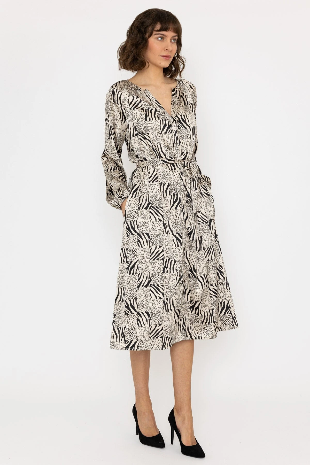 Ladies long sleeve v-neck dress in mono print by Rowen Avenue. Look stylish and stay comfortable in this midi dress. Featuring a button placket, midi length, and beautiful animal print, this dress is perfect for any occasion. Enjoy the flattering fit and modern design of this timeless piece!