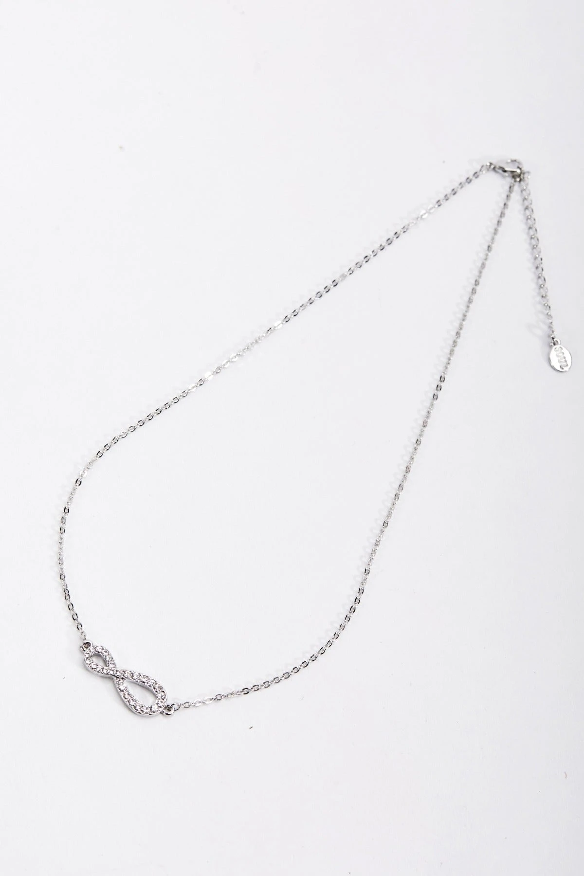 Silver Diamante Infinity Necklace by Soul Jewellery. With its intricate infinity design adorned with shimmering diamante stones, it is the perfect everyday necklace.