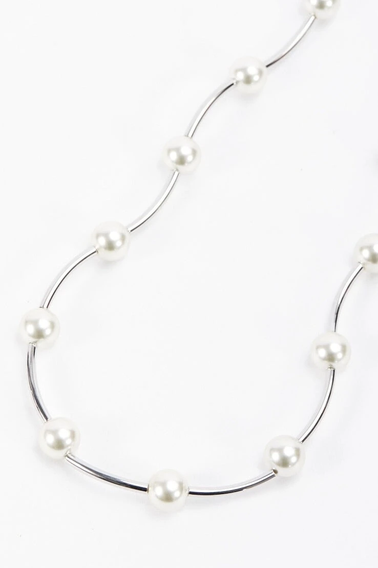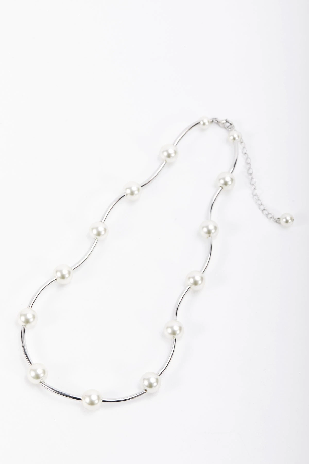 Silver Tone Curved Pearl Necklace by Soul Jewellery. This stunning piece features a unique curved design with pearls that will add a touch of sophistication to any outfit.