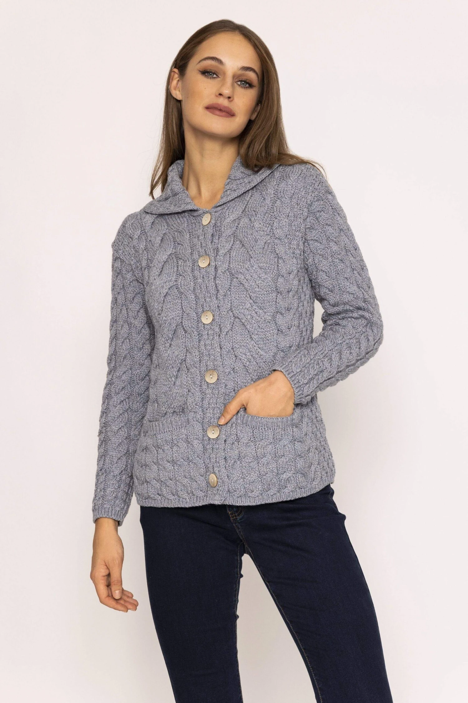 Women’s supersoft merino wool cardigan by Aran Woollen Mills, designed and knitted in Westport, Co.Mayo Ireland.