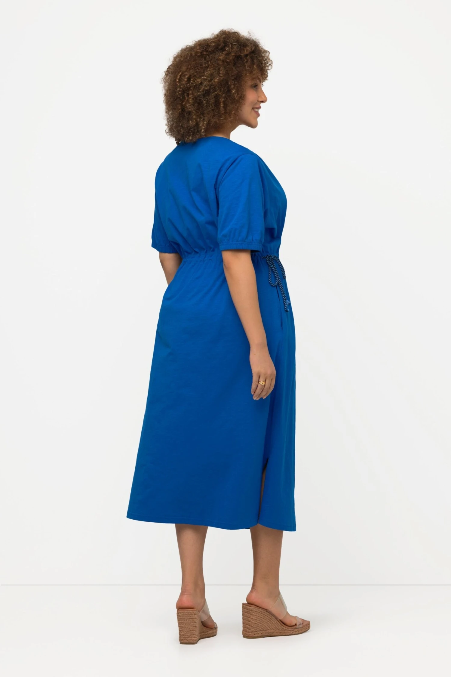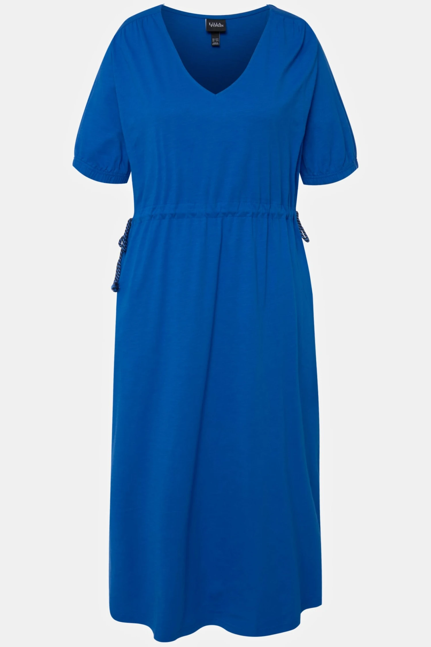 Blue short sleeve drawstring waist midi dress by Ulla Popken.