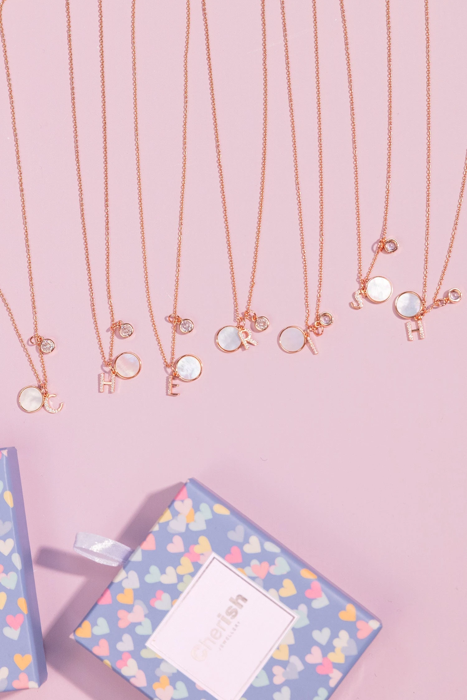Initial necklace in rose gold with mother of pearl detailing by Cherish. Timeless, beautiful jewellery that can be collected, worn and loved again and again. Presented in a beautiful gift box that will make an ideal gift for a loved one or a treat for yourself.