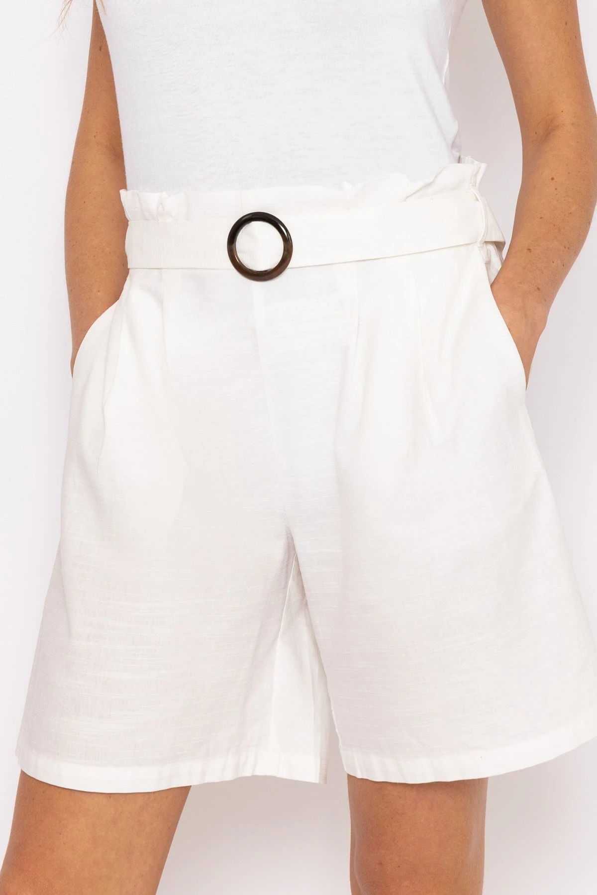 High waist knee length shorts in white by Rowen Avenue. These easy to wear summer shorts are a holiday wardrobe essential.