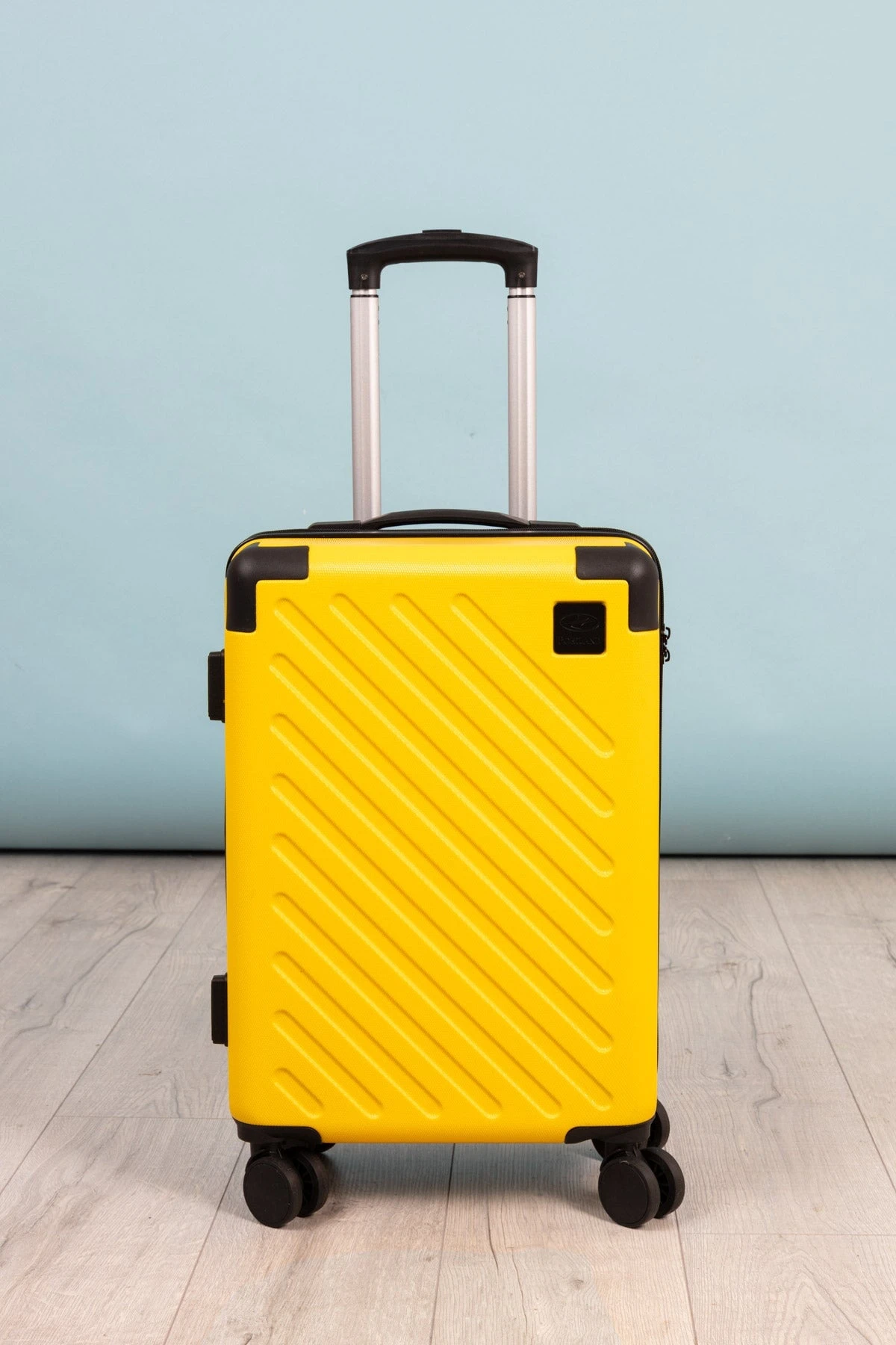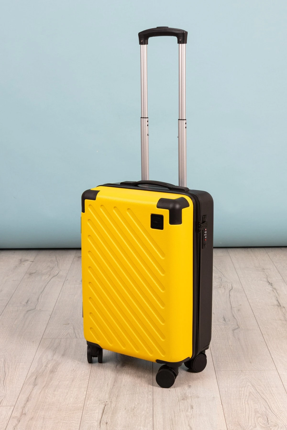 Yellow lightweight ,hard-shell 4 wheel suitcase.